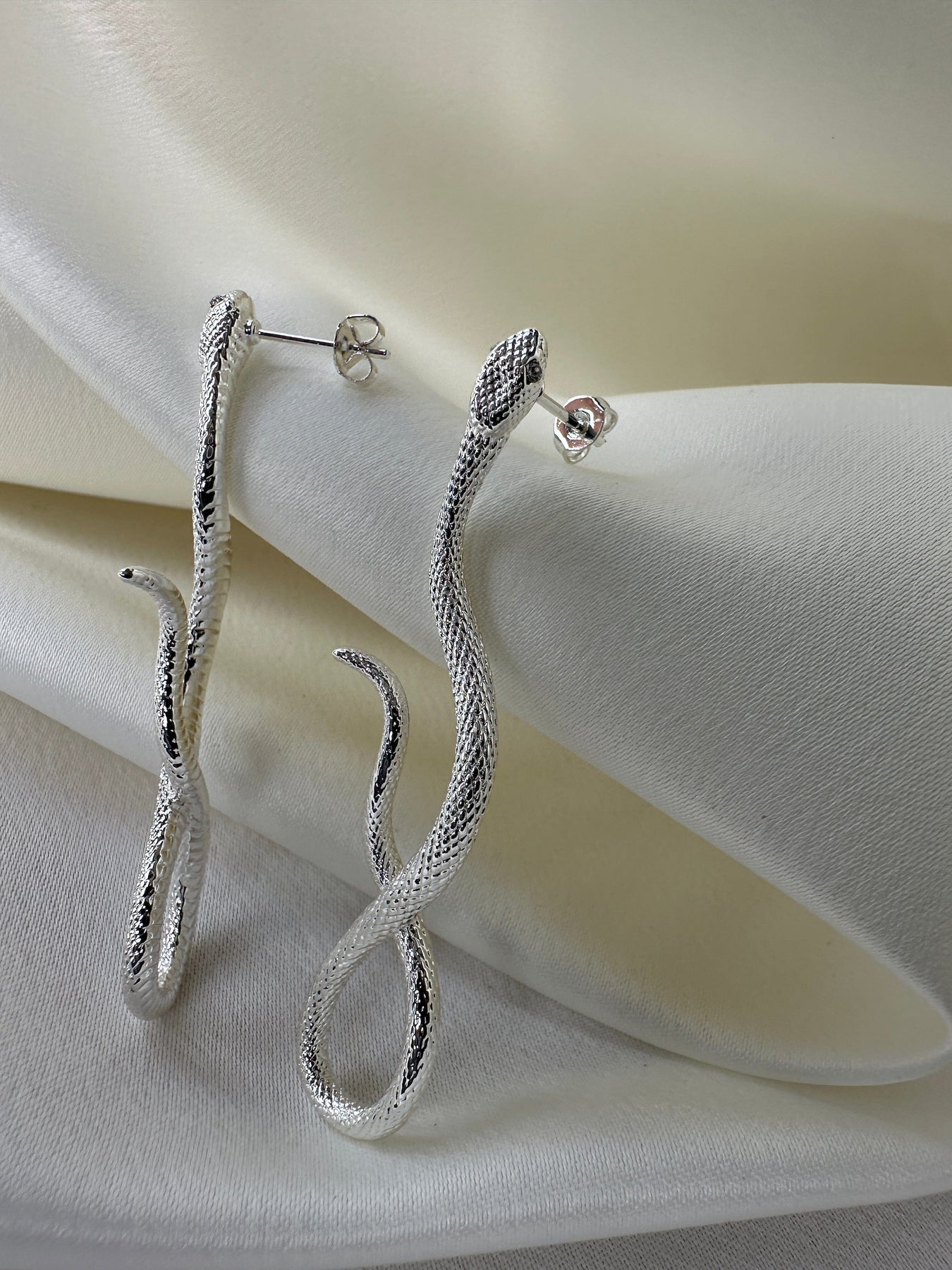 Schlangenförmiger Ohrring von O element mit einem detaillierten Schuppenmuster. Der Ohrring ist aus Messing mit einer silberfarbenen Oberfläche gefertigt und hat kleine CZ-Steine als Augen.