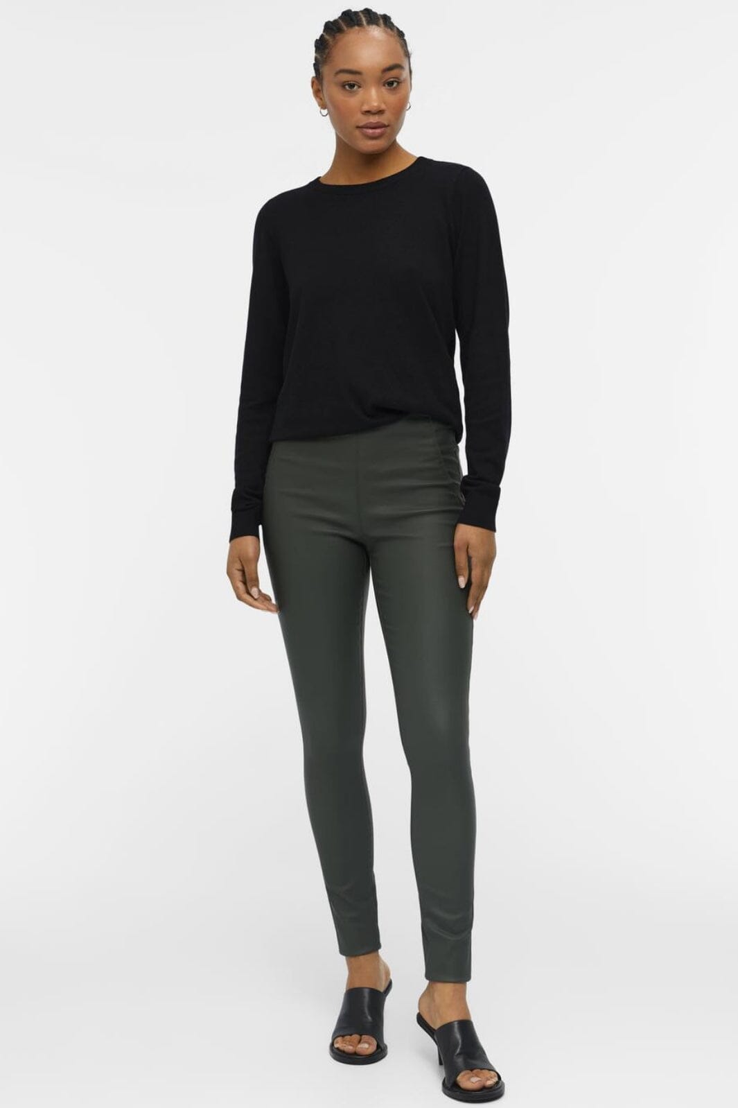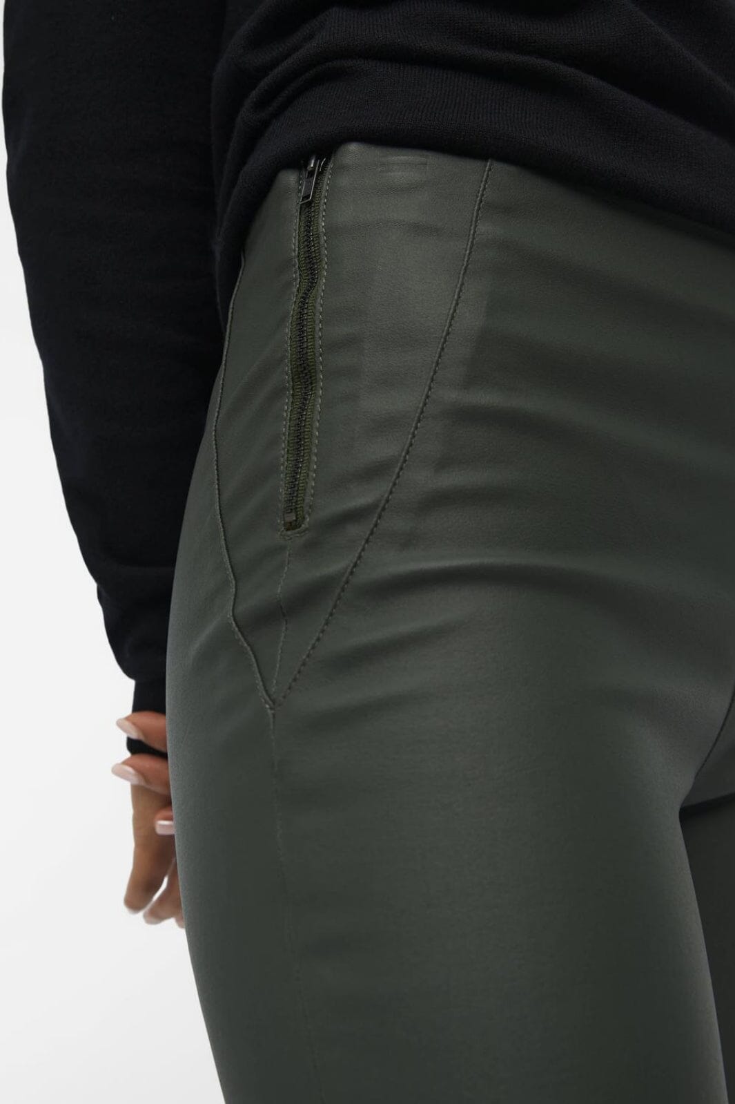 Coated Leggings von Object in einem dunkelgrünen Farbton. Sie haben eine enge Passform und eine glänzende Oberfläche, die an Leder erinnert.