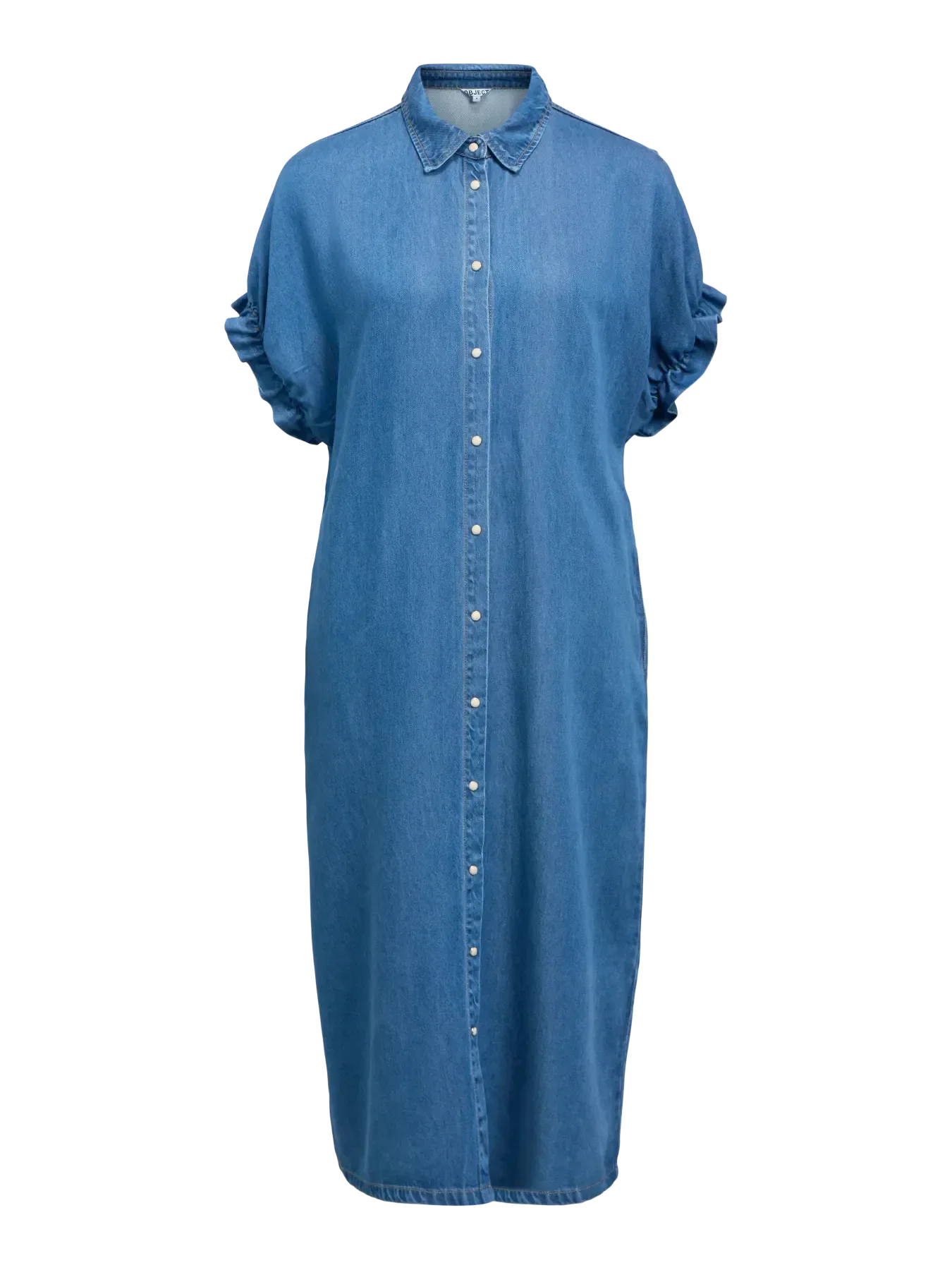 Denimkleid von Object in mittelblau. Das Kleid hat einen Hemdkragen, Knöpfe entlang der gesamten Länge und kurze Ärmel mit Rüschen. Der lockere Schnitt reicht bis zur Mitte der Wade.