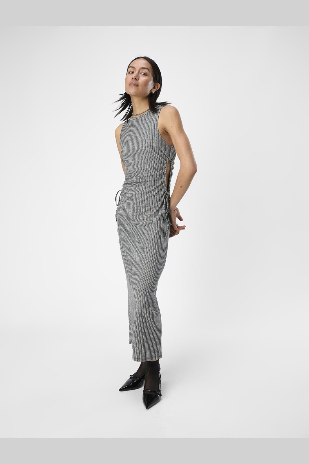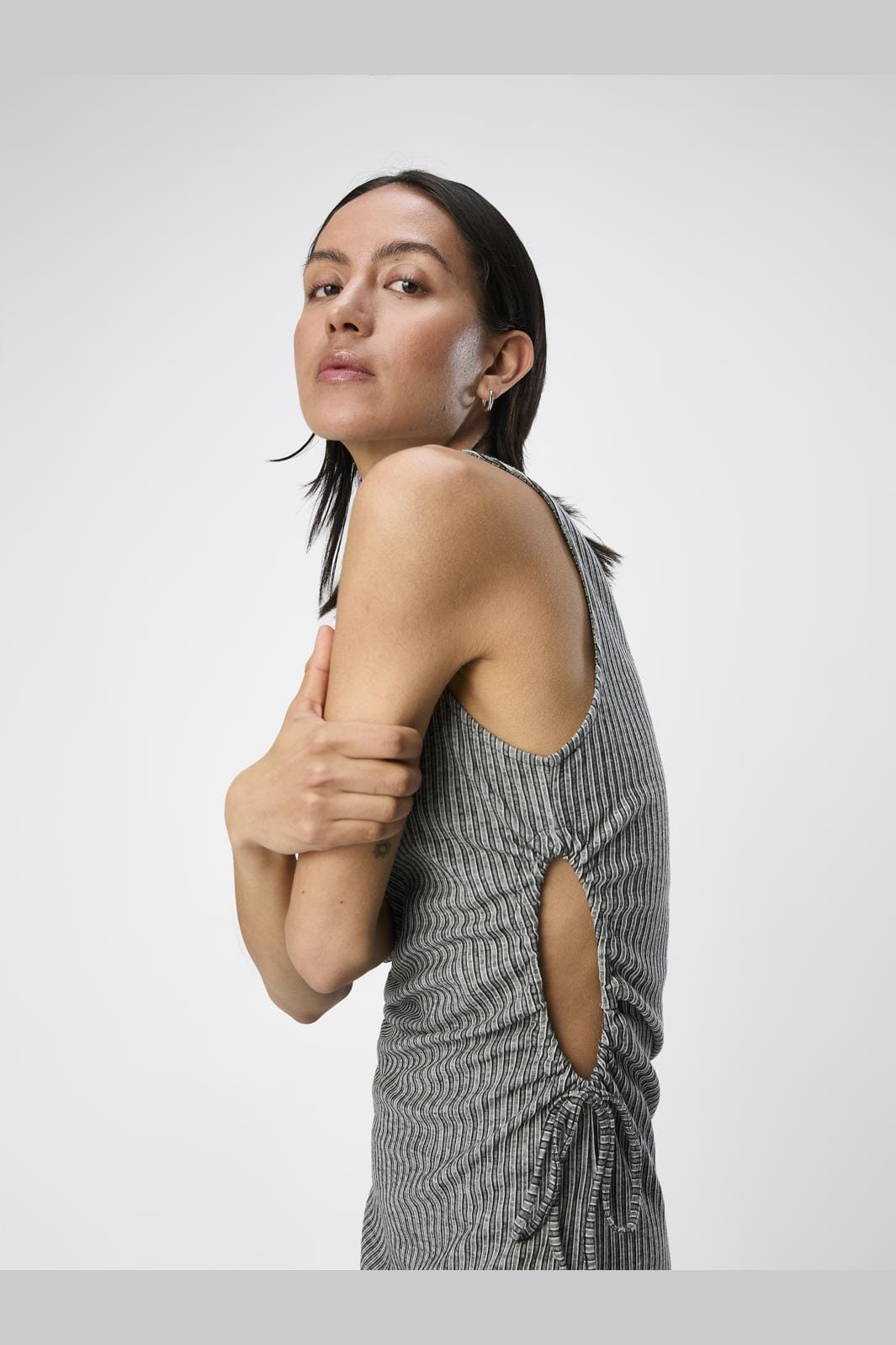 Grau gestreiftes Kleid von Object aus Jersey mit Stretch. Das Kleid hat einen runden Ausschnitt, ärmelloses Design und Schnürdetails an den Seiten, die eine Anpassung der Passform ermöglichen.