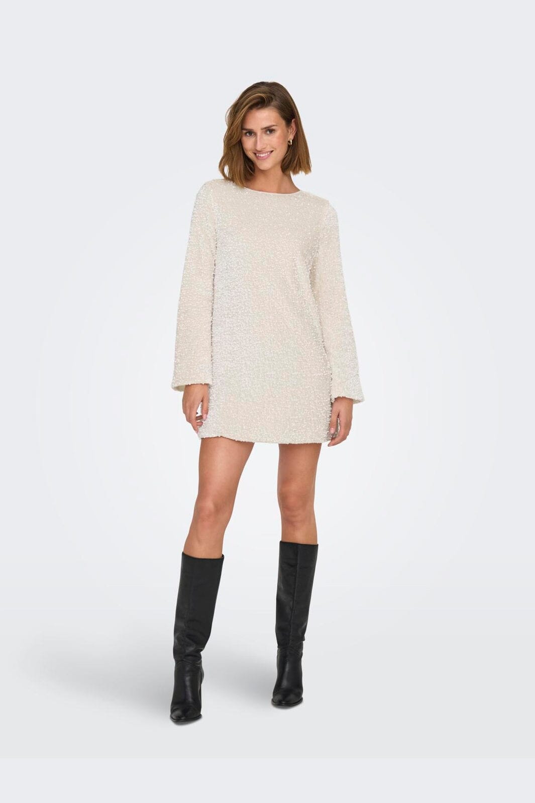 Paillettenkleid von Only in einem hellen Creme-Ton. Das Kleid hat lange Ärmel, die mit Pailletten bedeckt sind, und eine schwarze Schleife auf der Rückseite.