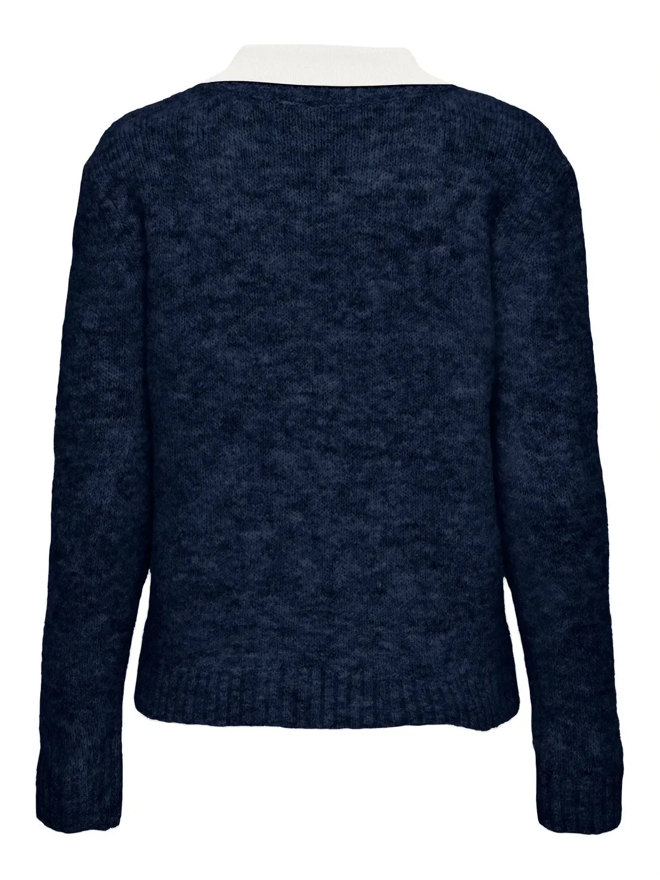Dunkelblaue melierte Strickjacke von Only mit einem kontrastfarbigen weißen Polokragen. Der Pullover ist aus Flachstrick mit langen Ärmeln und einer lockeren Passform.