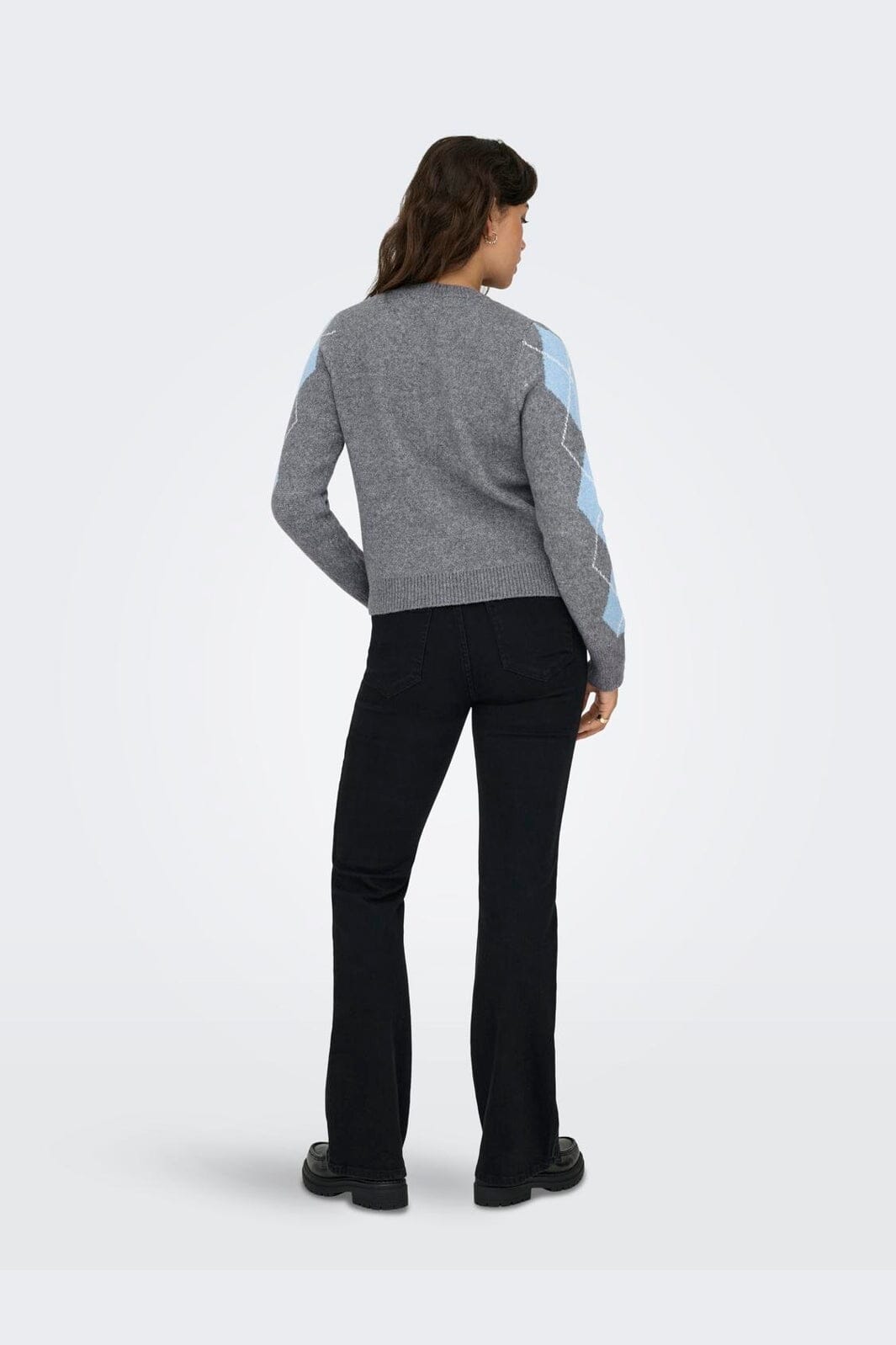 Graue Strickjacke von Only mit Argyle-Muster in Hellblau und Grau. Gestrickt aus einer Mischung aus recyceltem Polyester, Acryl, Wolle und Elasthan mit Knopfverschluss und Rundhalsausschnitt.