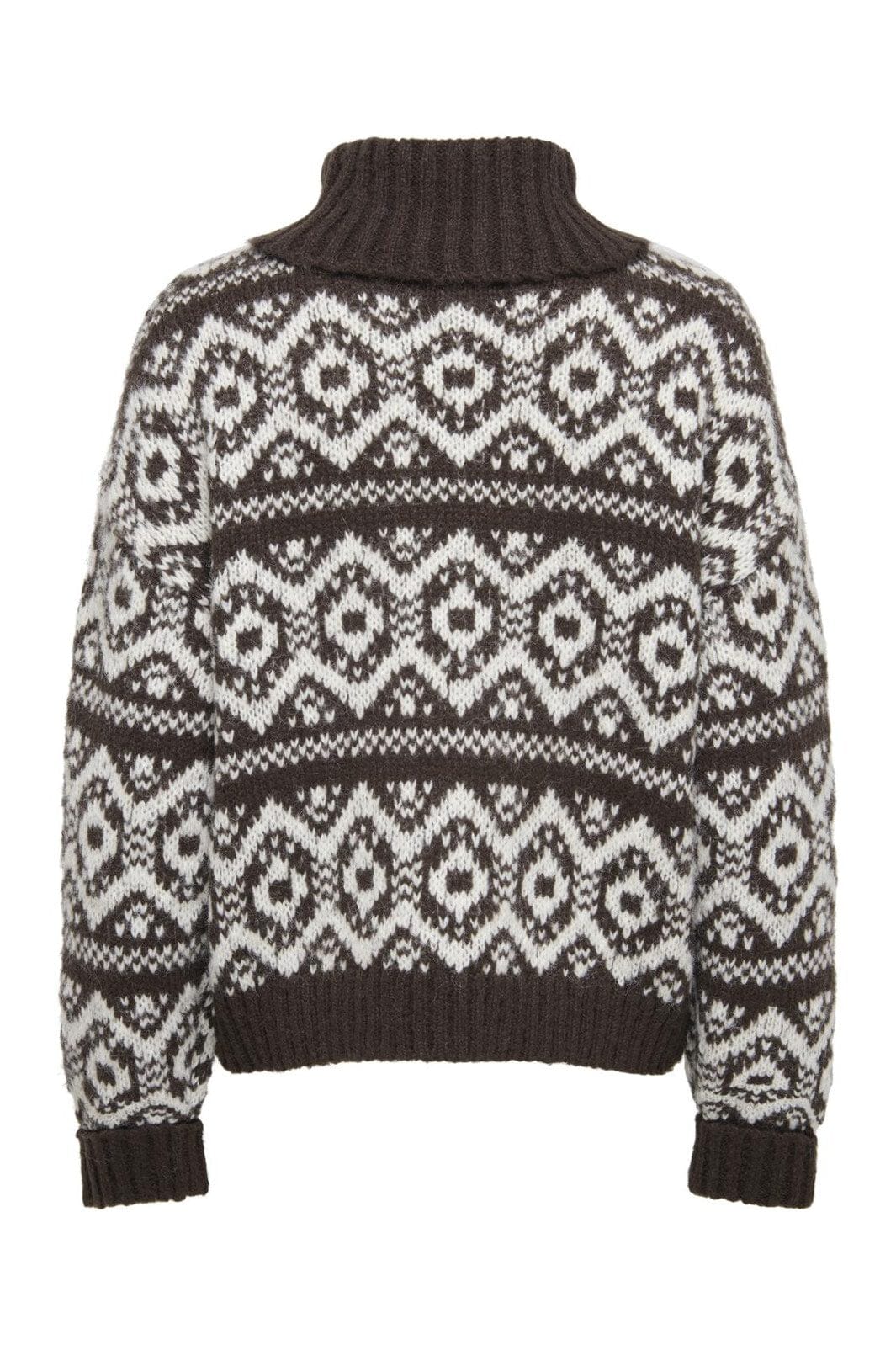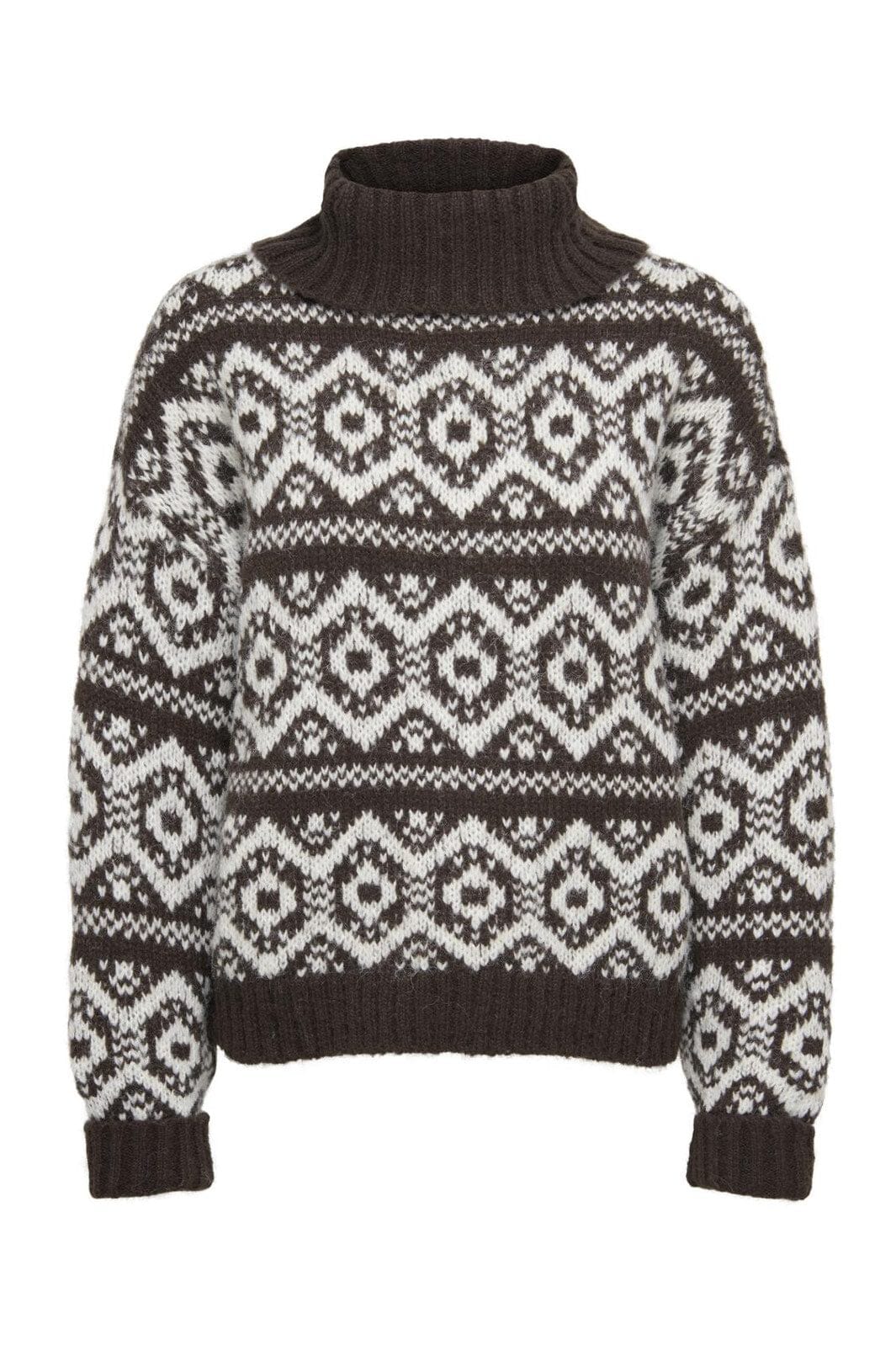 Strickpullover von Only in Dunkelbraun mit weißem geometrischem Muster. Er hat eine lockere Passform mit abgesenkten Schultern und einem hohen Rollkragen, der an kühlen Tagen schön warm hält.