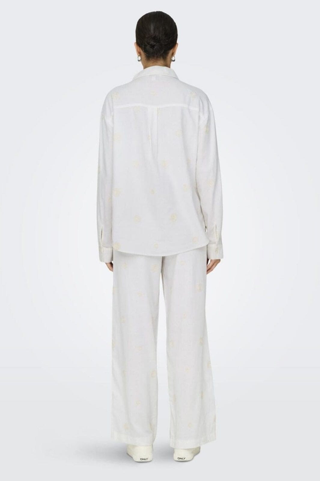 Weiße Bluse von Only mit kreisförmigen Stickmustern. Die Bluse hat lange Ärmel, einen Kragen und eine Knopfleiste vorne. Eine Brusttasche und eine lockere Passform verleihen der Bluse einen entspannten Look.