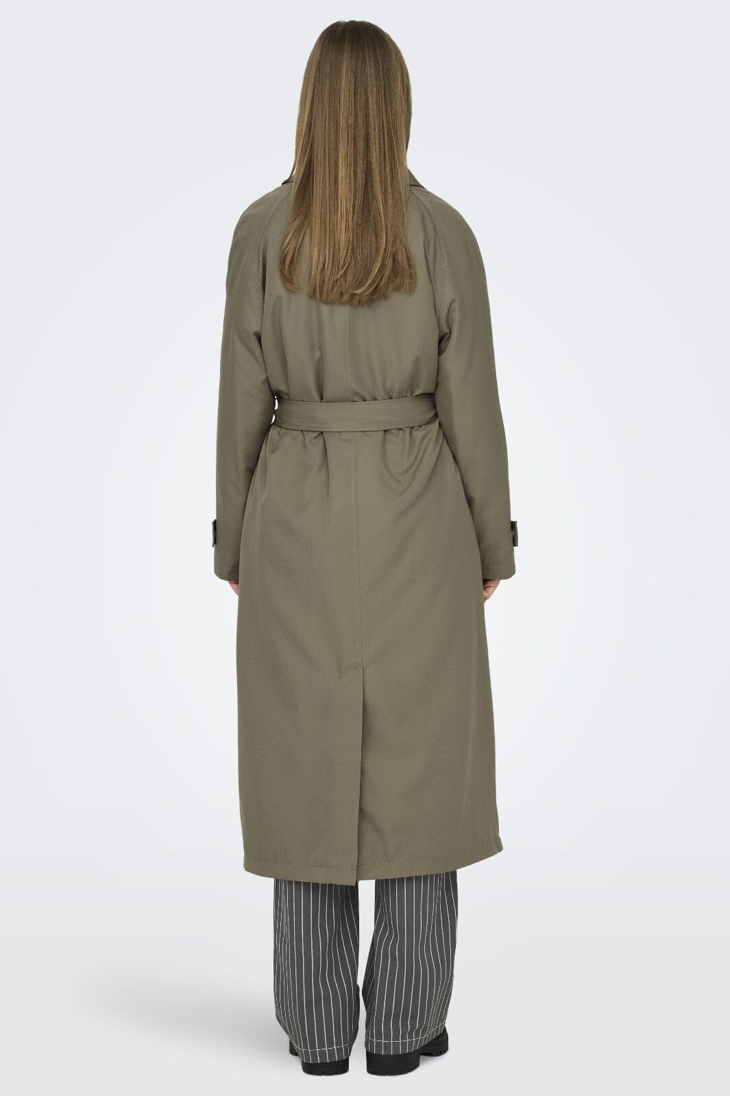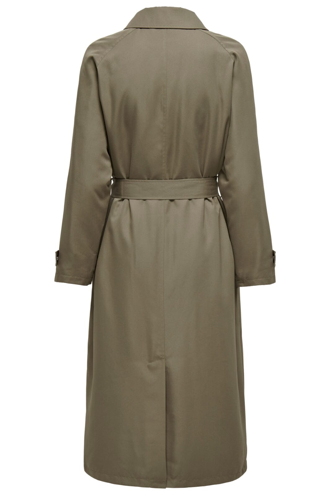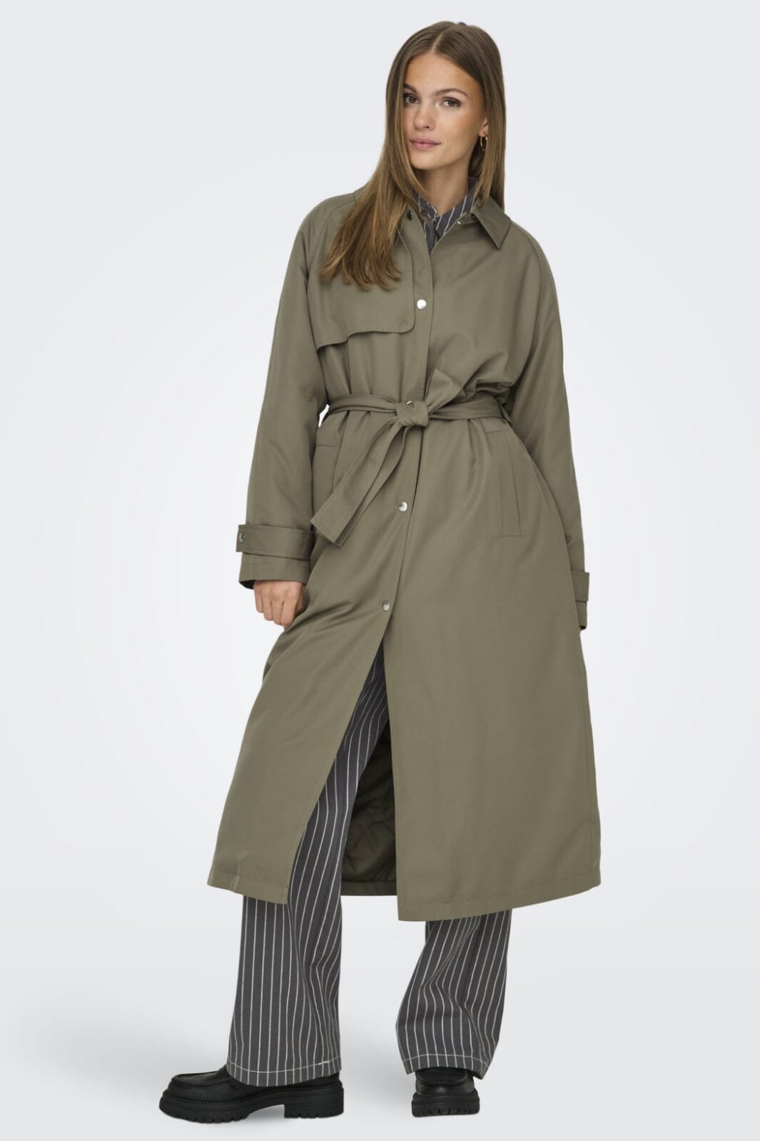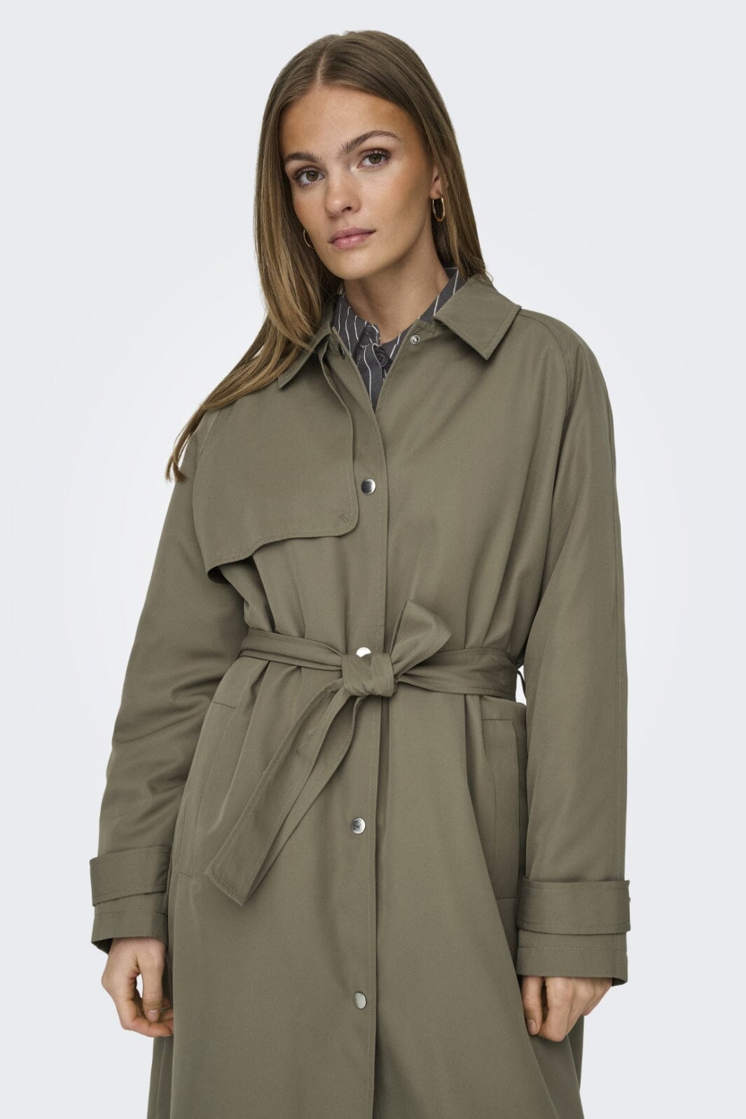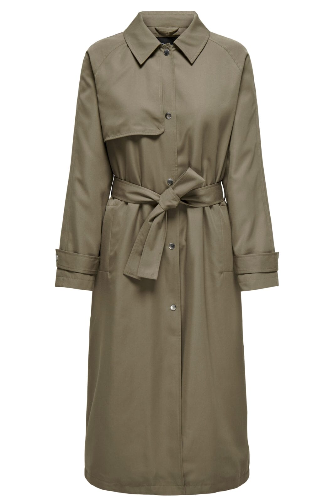 Langer Trenchcoat von Only in einem olivgrünen Farbton. Der Mantel hat einen Hemdkragen, Knöpfe vorne und einen Gürtel in der Taille, der es einfach macht, die Passform anzupassen.