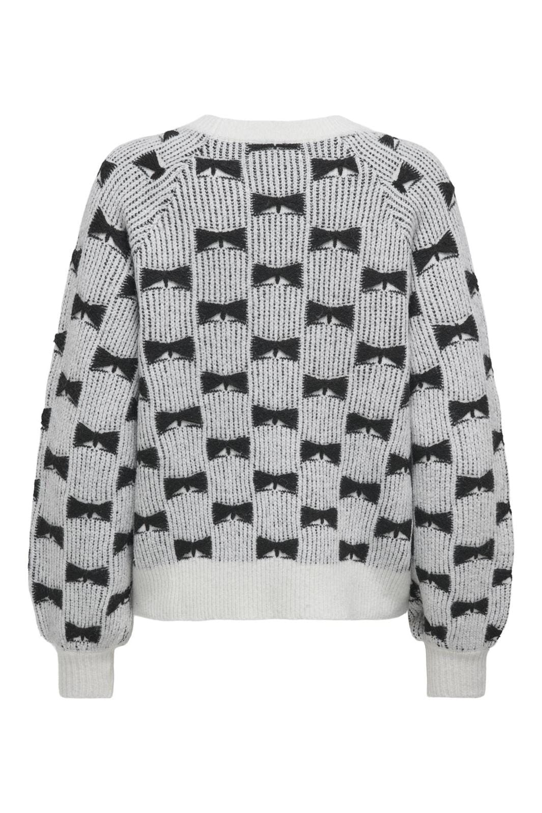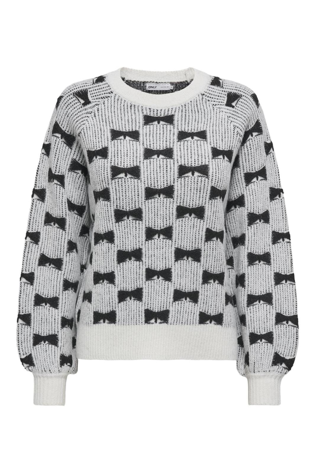 Strickpullover von Only in Weiß mit schwarzen Schleifen. Sie hat einen Rundhalsausschnitt und lange Ballonärmel mit Rippbündchen an den Manschetten. Das Schleifenmuster zieht sich über die gesamte Pullover in einem schwarzen Druck auf dem hellen Hintergrund.