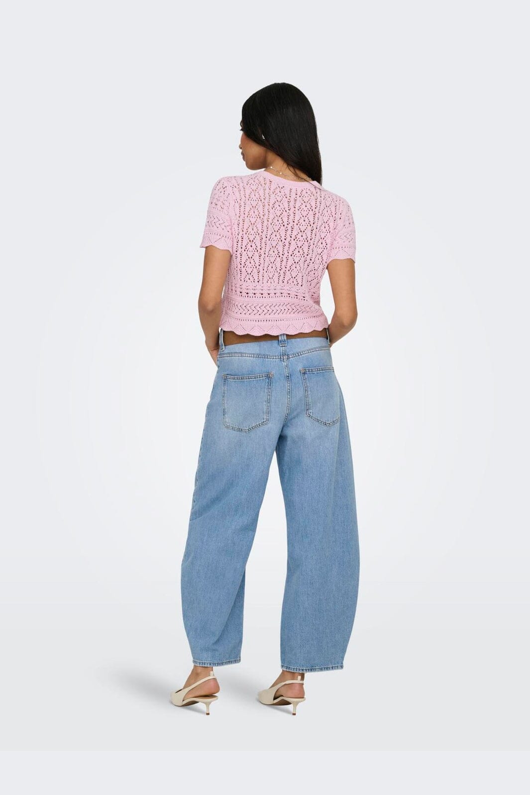 Rosa Cardigan von Only mit Spitze und Perlendetails. Die Strickjacke hat kurze Ärmel, eine Knopfleiste und eine kurze, cropped Passform mit Muschelsaum-Nähten.