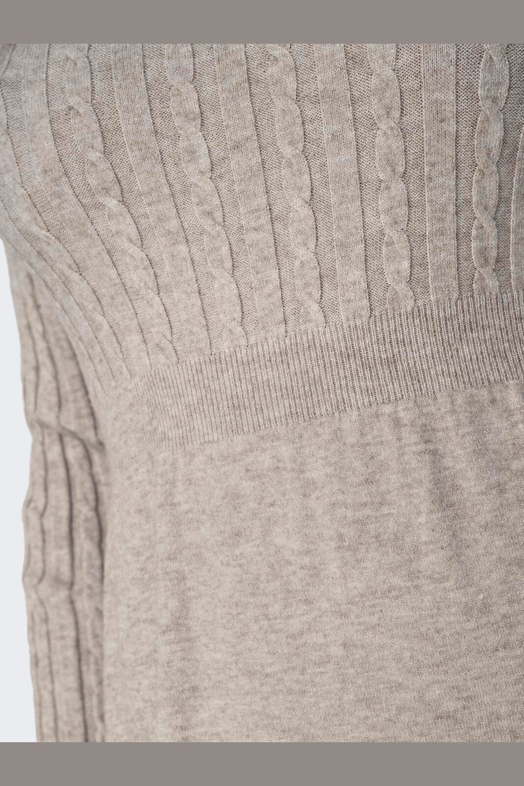 Gestricktes Kleid von Only in grauen und beige melierten Tönen. Das Kleid hat ein Zopfmuster auf dem Oberteil und den Ärmeln sowie einen runden Halsausschnitt.