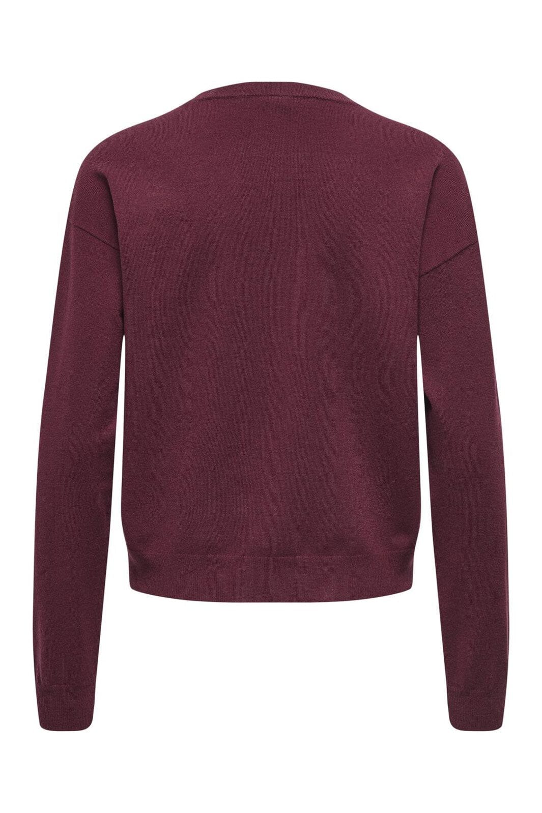 Strickpullover von Only in tiefroter Burgunderfarbe. Die Vorderseite hat ein Rautenmuster, das mit Pailletten verziert ist, und der Pullover hat einen runden Halsausschnitt.