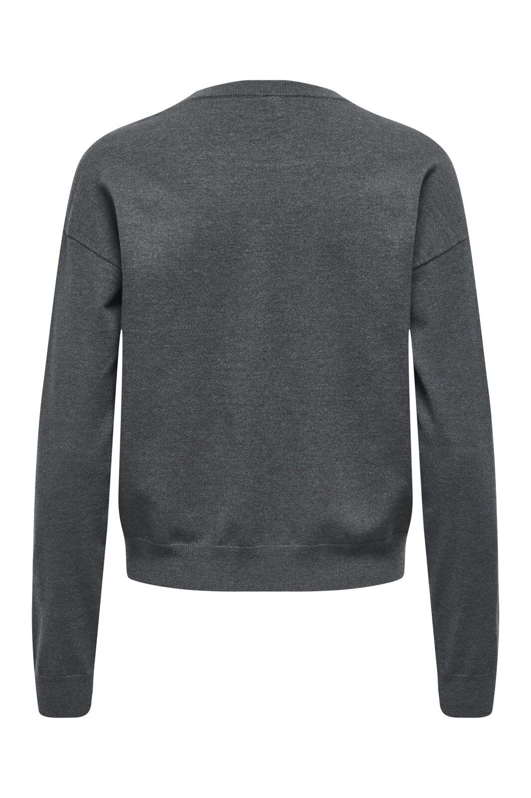 Ein dunkelgrauer Strickpullover von Only mit Pailletten. Die Farbe ist ein melierter Grauton, und die Pailletten bilden ein glänzendes Muster auf der Vorderseite.