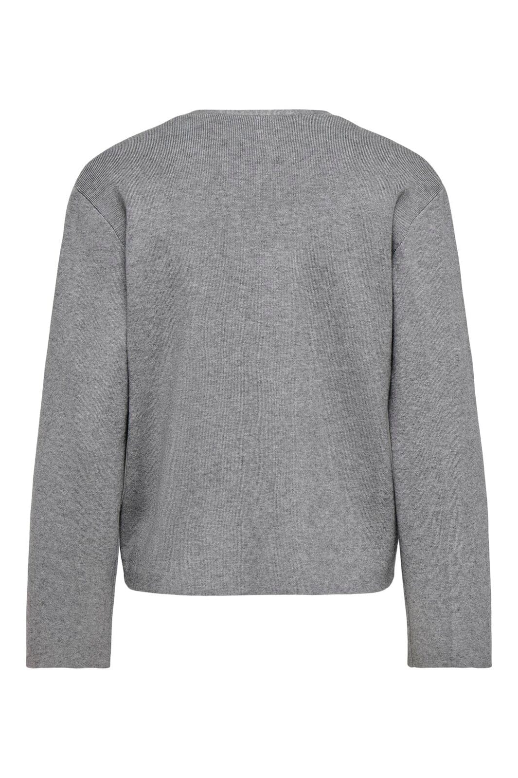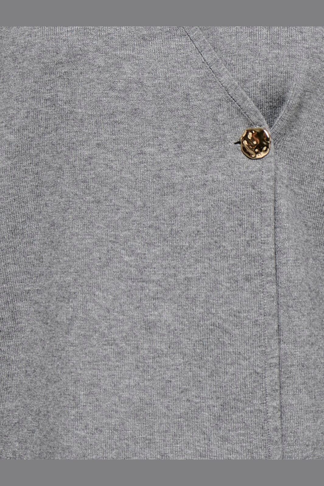 Graue Strickjacke von Only mit melierter Oberfläche. Die Strickjacke hat einen V-Ausschnitt und wird mit einem einzelnen goldfarbenen Knopf geschlossen.