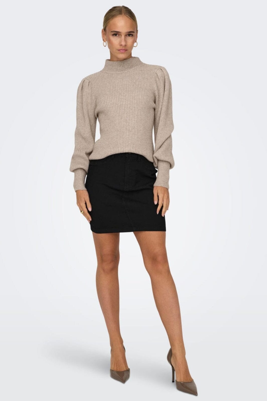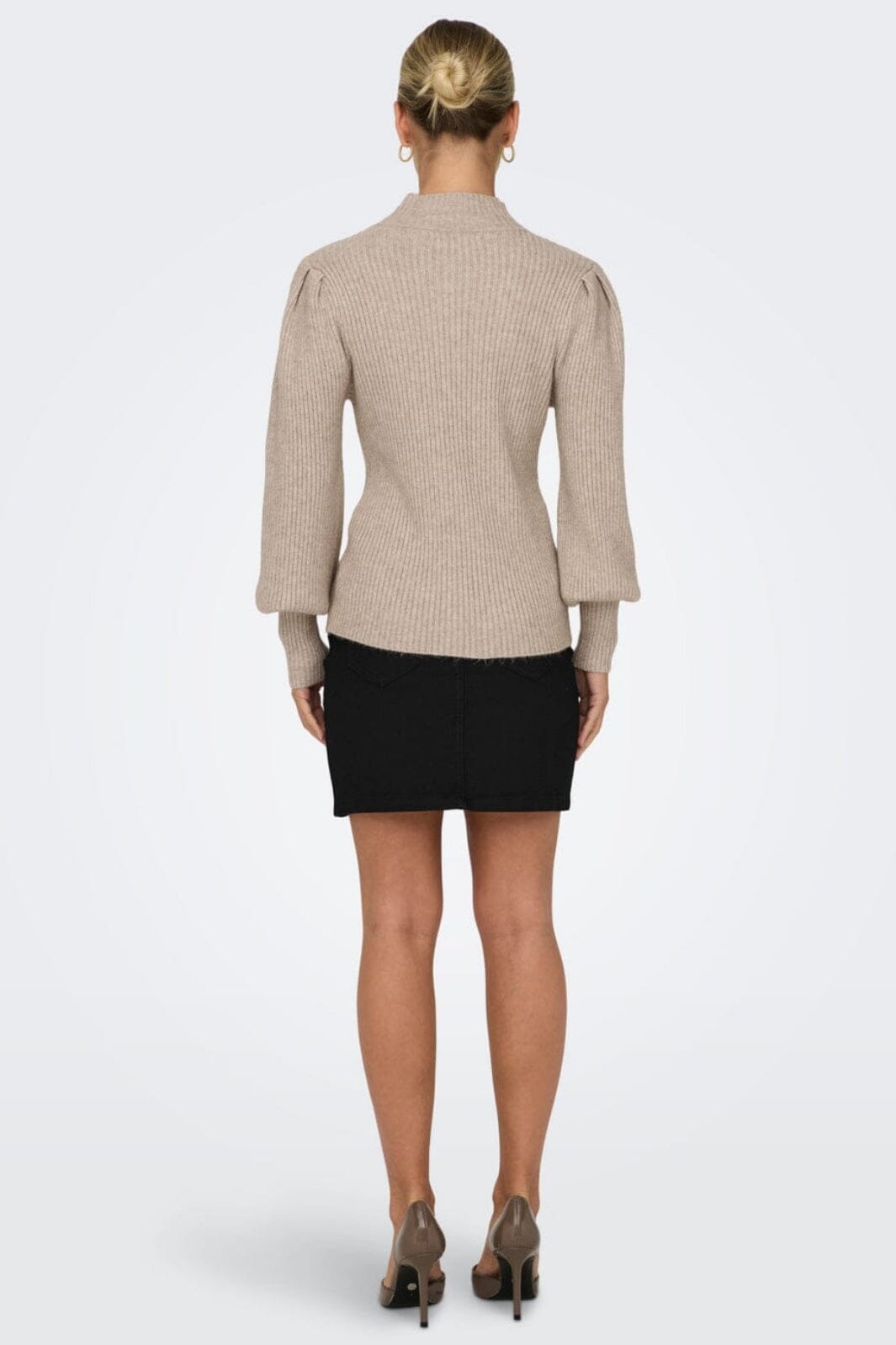 Rippstrickpullover von Only in Beige Melange. Der Strickpullover hat einen hohen Kragen und lange Ärmel mit Puffeffekt, die eine weiche und bequeme Passform bieten.