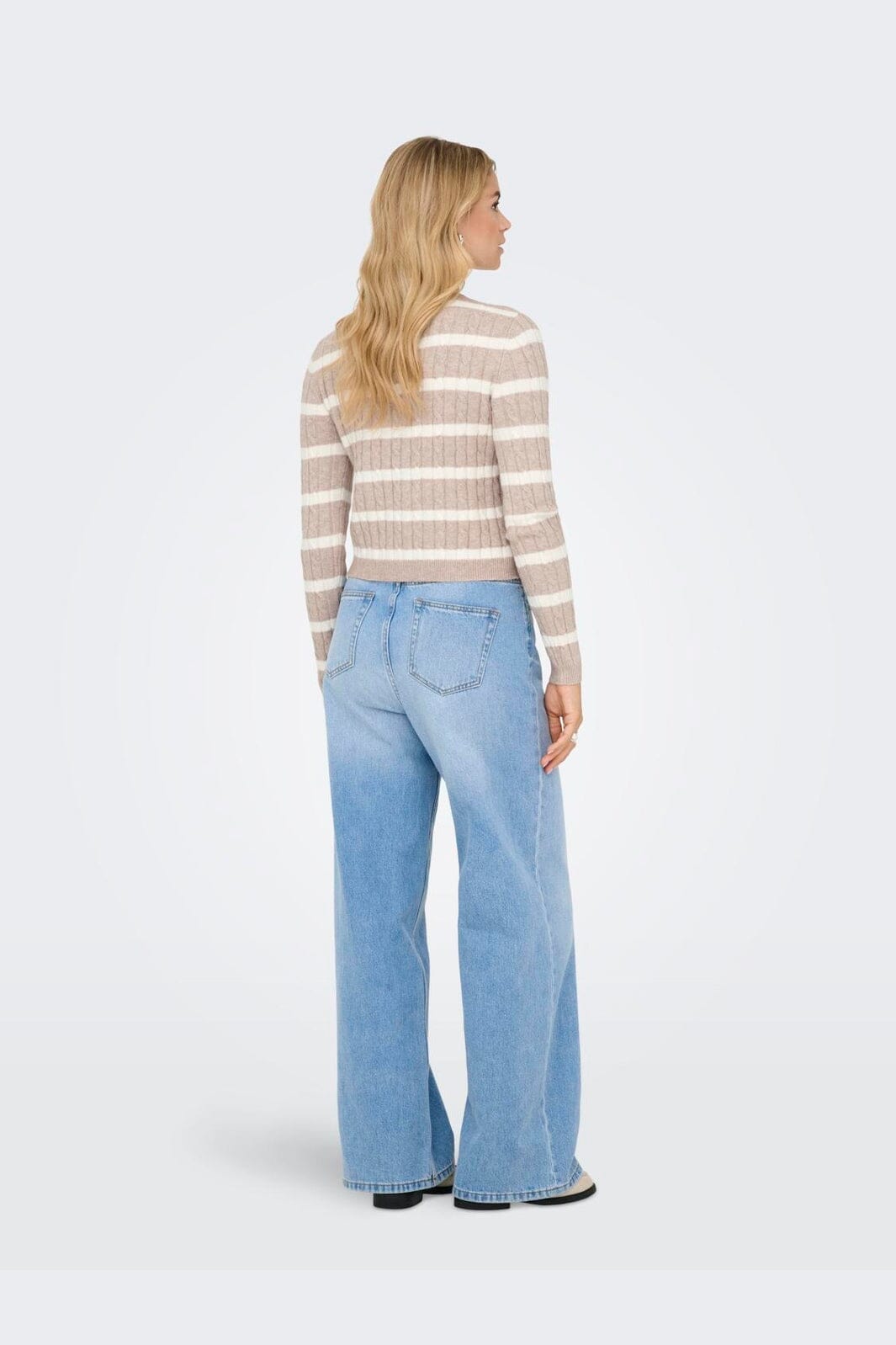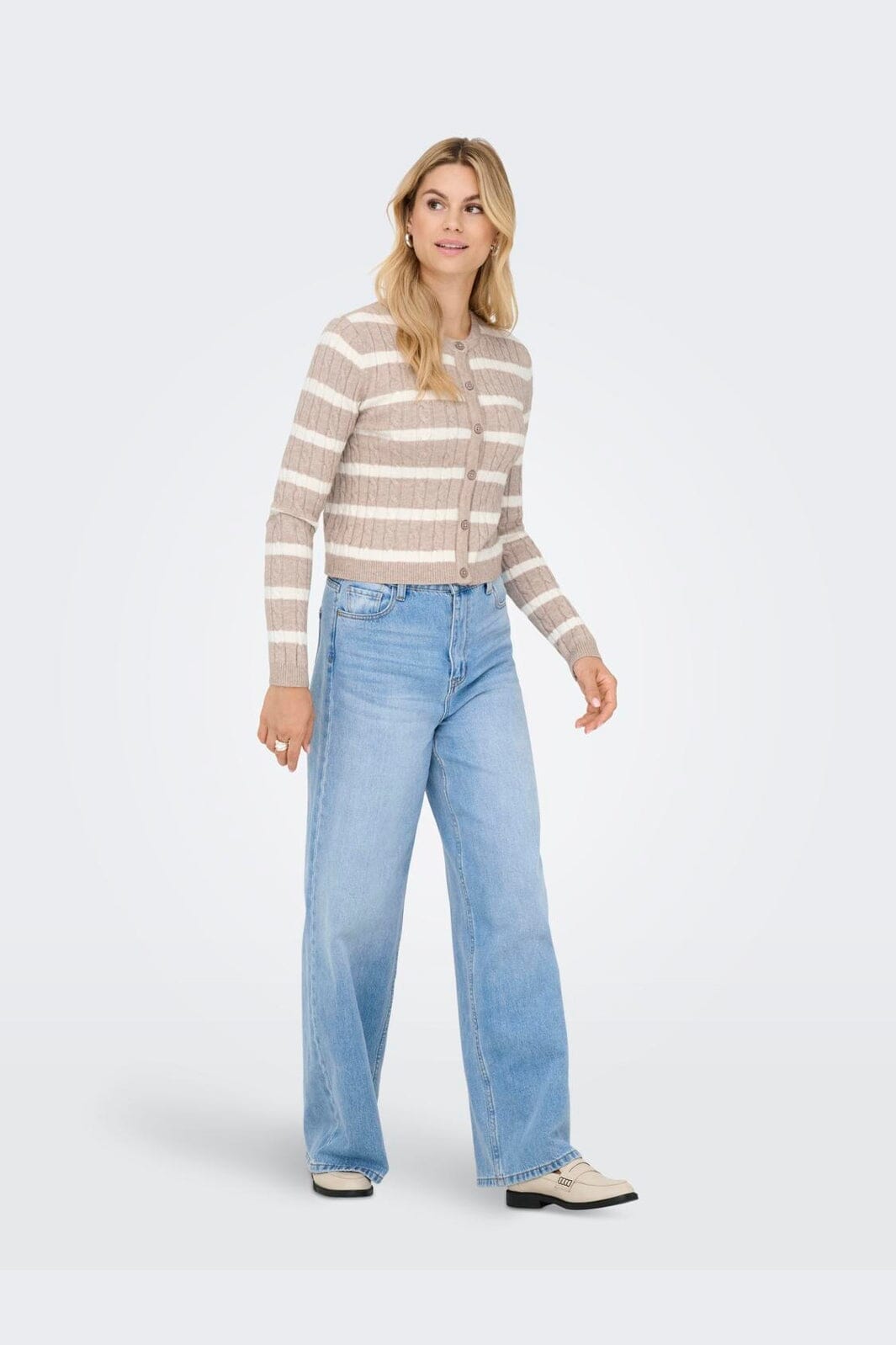 Gestreifte Strickjacke von Only mit Zopfmuster in beige und cremeweißen Tönen. Die Strickjacke hat einen Knopfverschluss und lange Ärmel mit gerippten Bündchen.