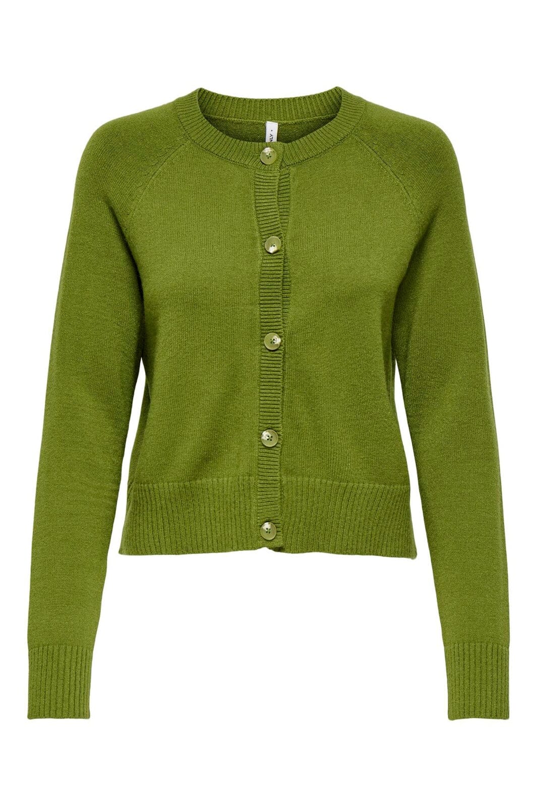 Kurz Cardigan von Only in der Farbe Grün Peat Moss. Gestrickt mit Rundhalsausschnitt und Knopfverschluss vorne. Rippbündchen an den Handgelenken und unten sorgen für eine gute Passform.