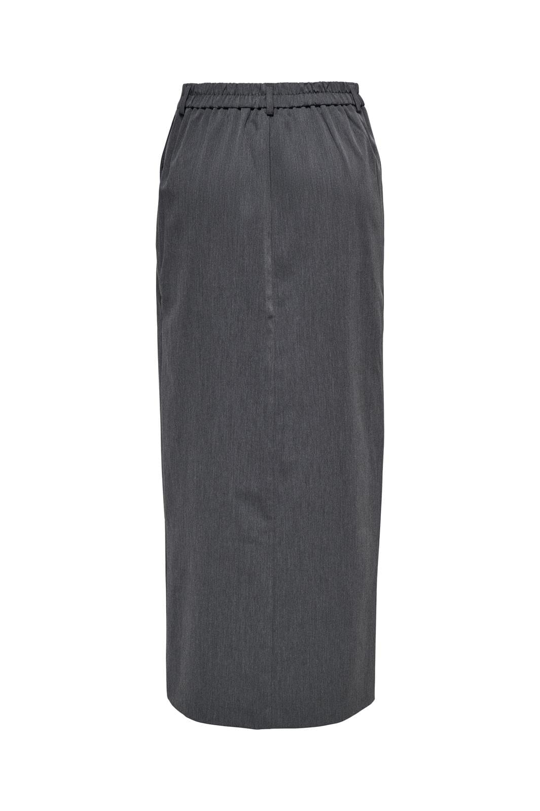 Grauer Maxirock von Only mit Seitentaschen und Schlitz vorne. Er hat ein flaches Taillenband vorne und ein elastisches Taillenband hinten. Der Reißverschluss im Schritt macht das Anziehen einfach.