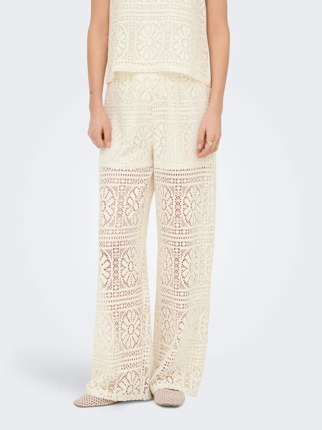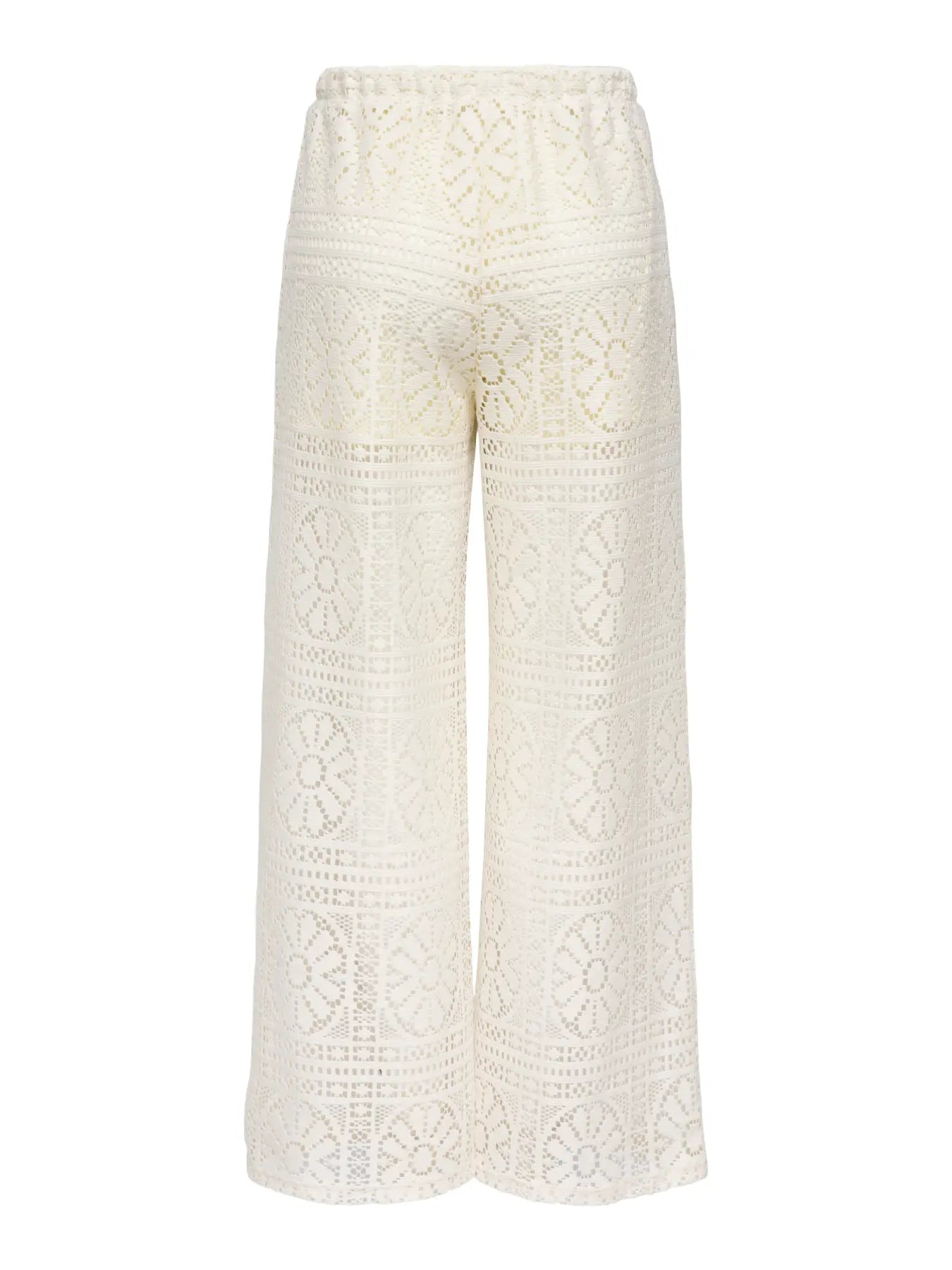 Weite Hosen von Only mit Spitzenmuster in einem cremeweißen Farbton. Die Hose hat einen elastischen Bund und besteht aus recyceltem Polyester und Baumwolle.