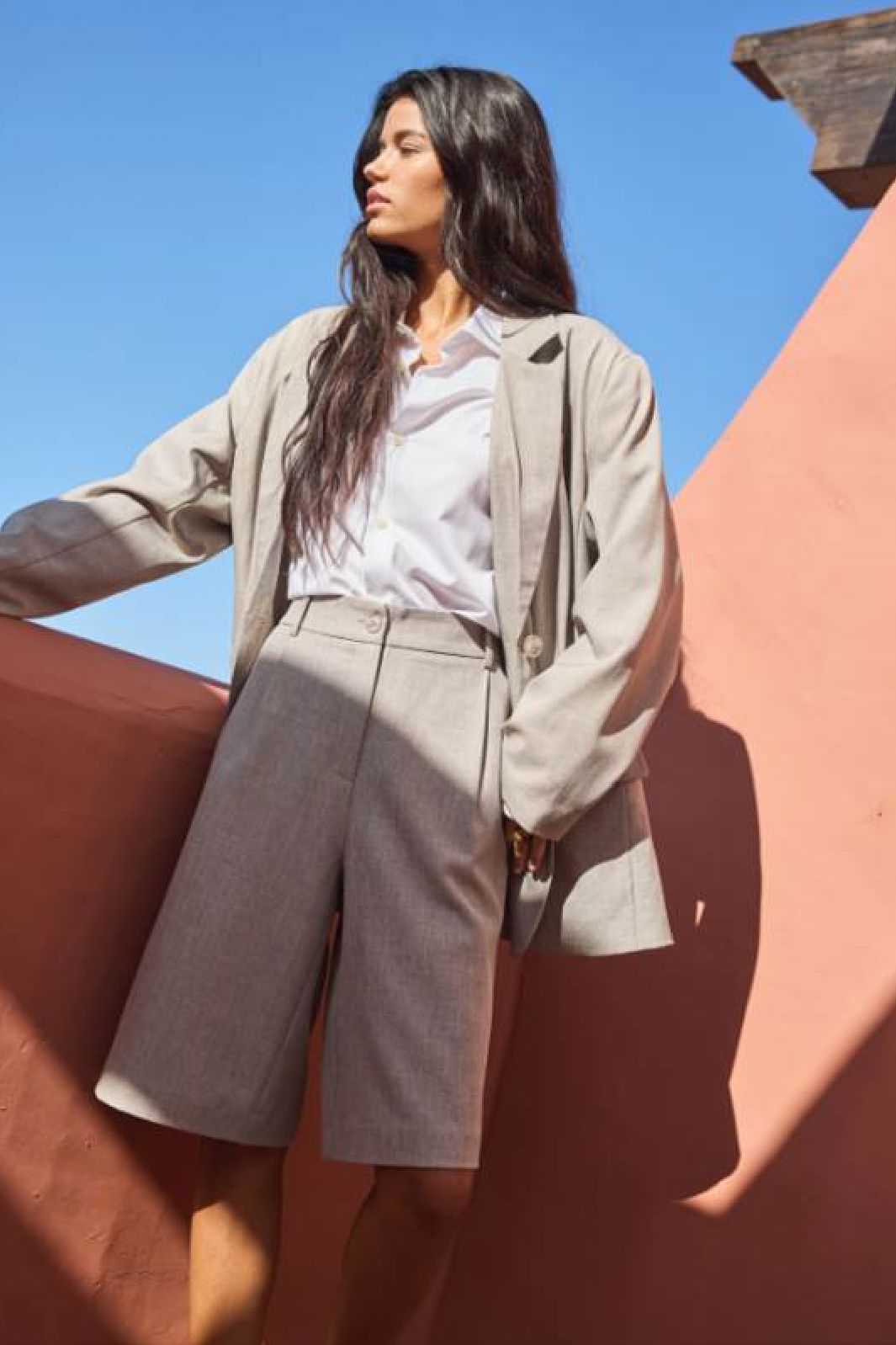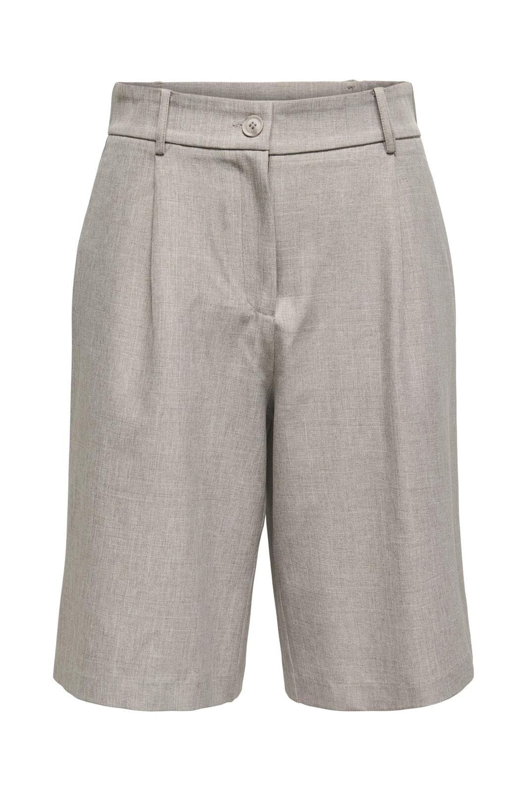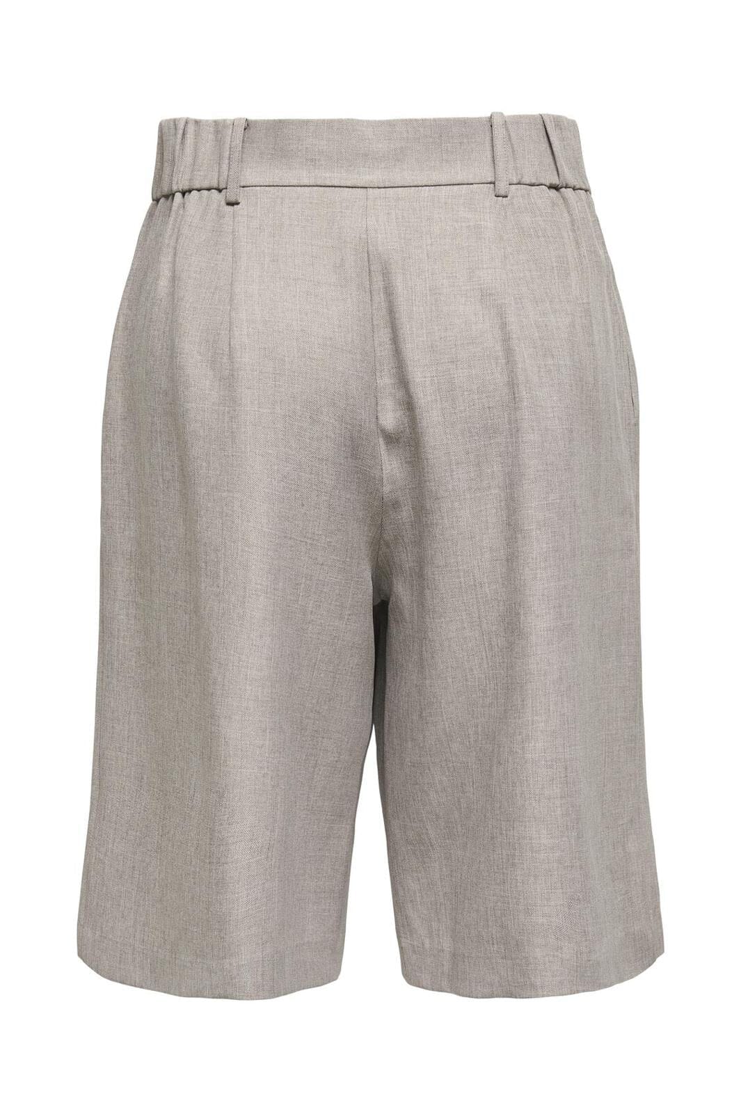 Knielange Bermudashorts in hellgrau melange mit hoher Taille und lockerer Passform. Die Shorts haben Falten vorne und praktische Seitentaschen sowie Gürtelschlaufen.