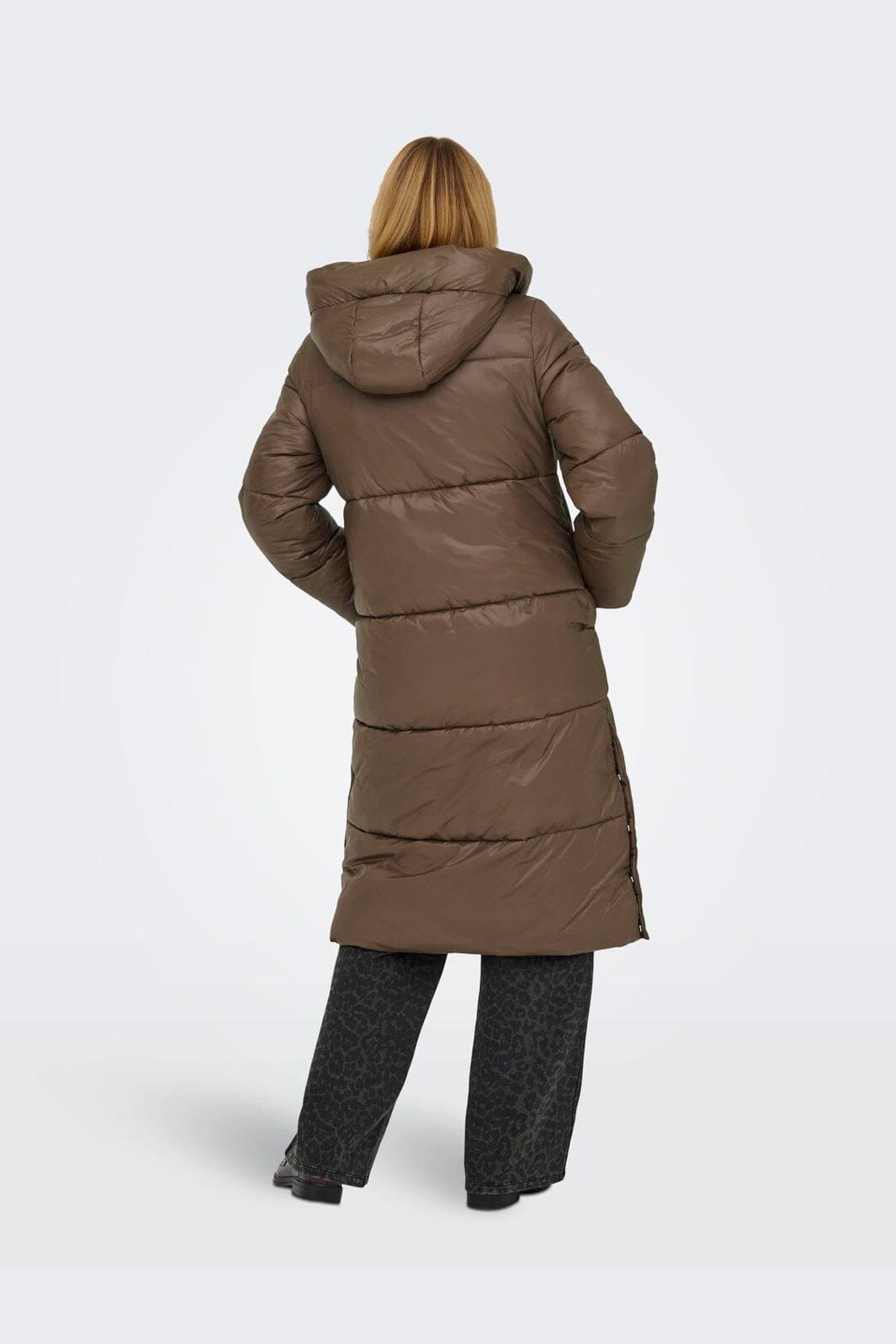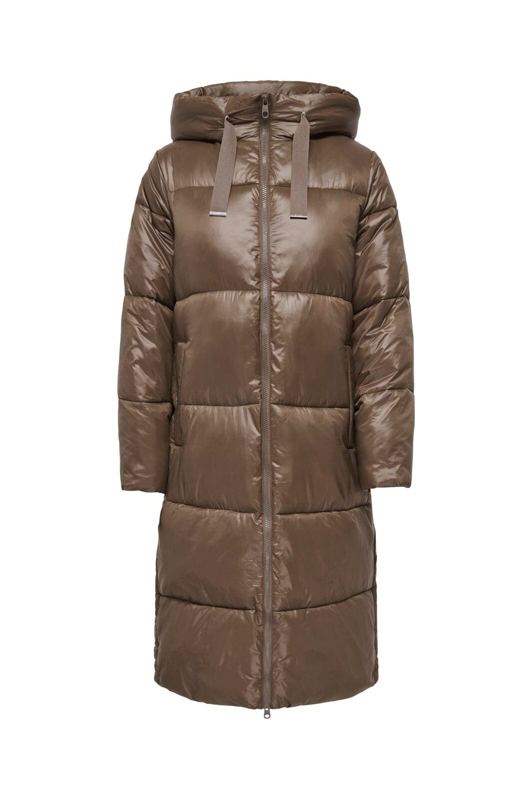 Langer Puffermantel von Only in brauner Farbe. Die Jacke ist aus 100 % Nylon gefertigt und hat eine Kapuze mit Kordelzug.