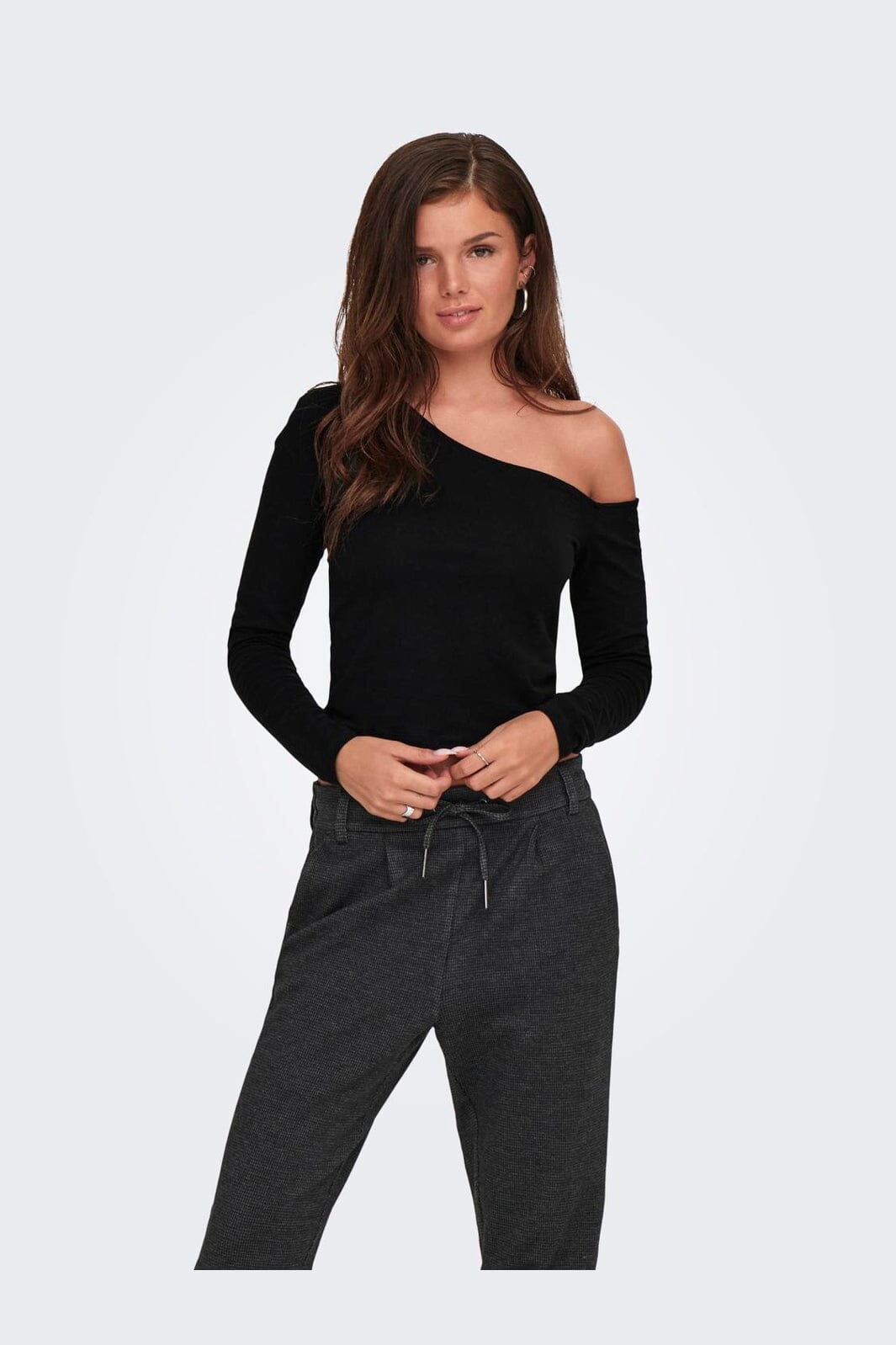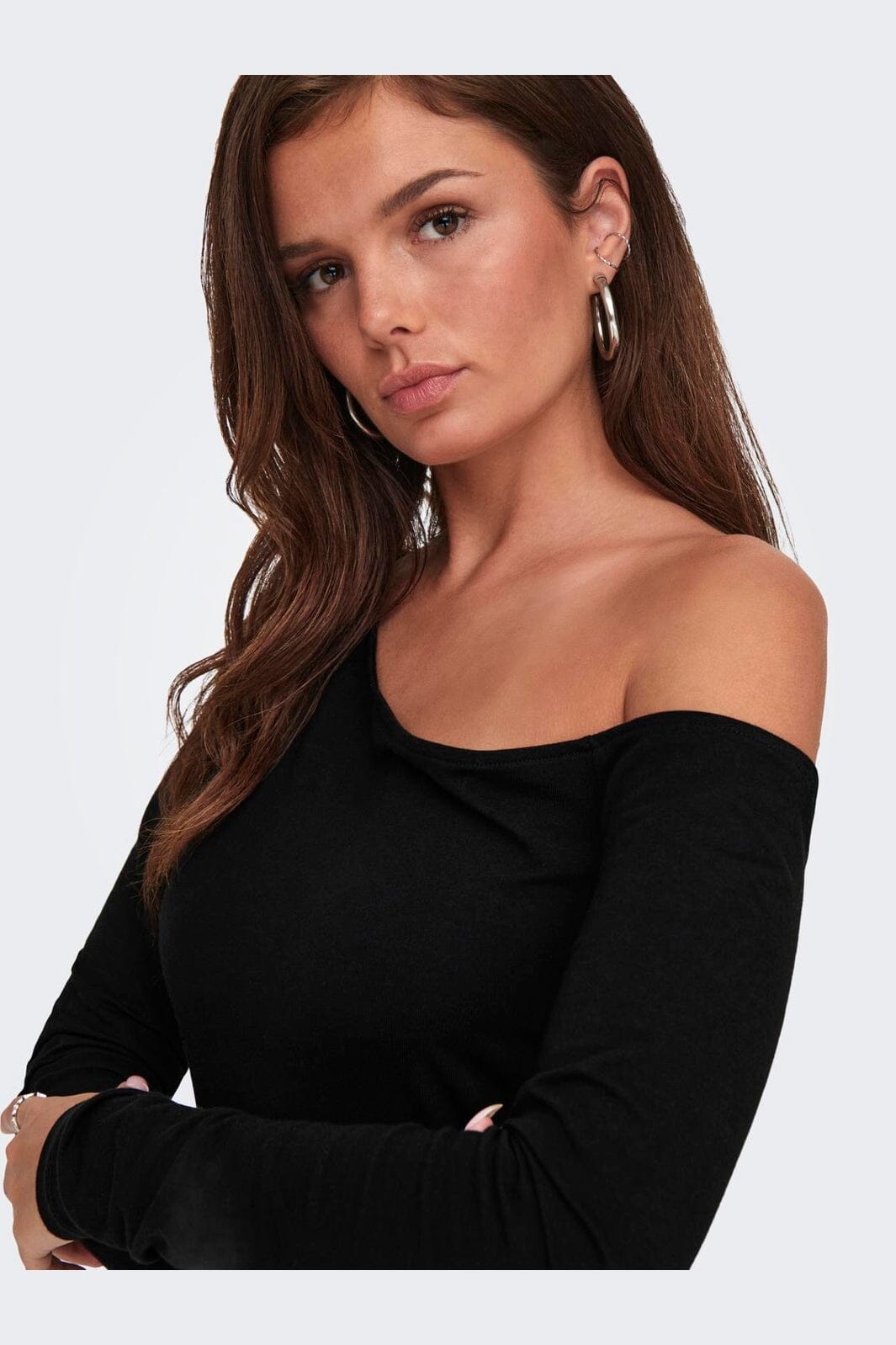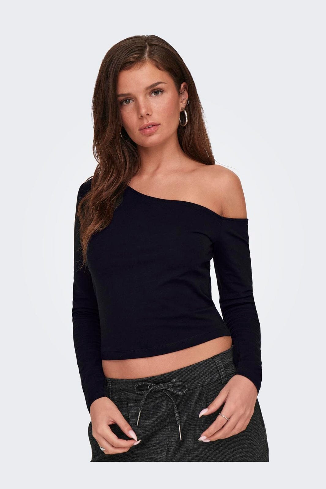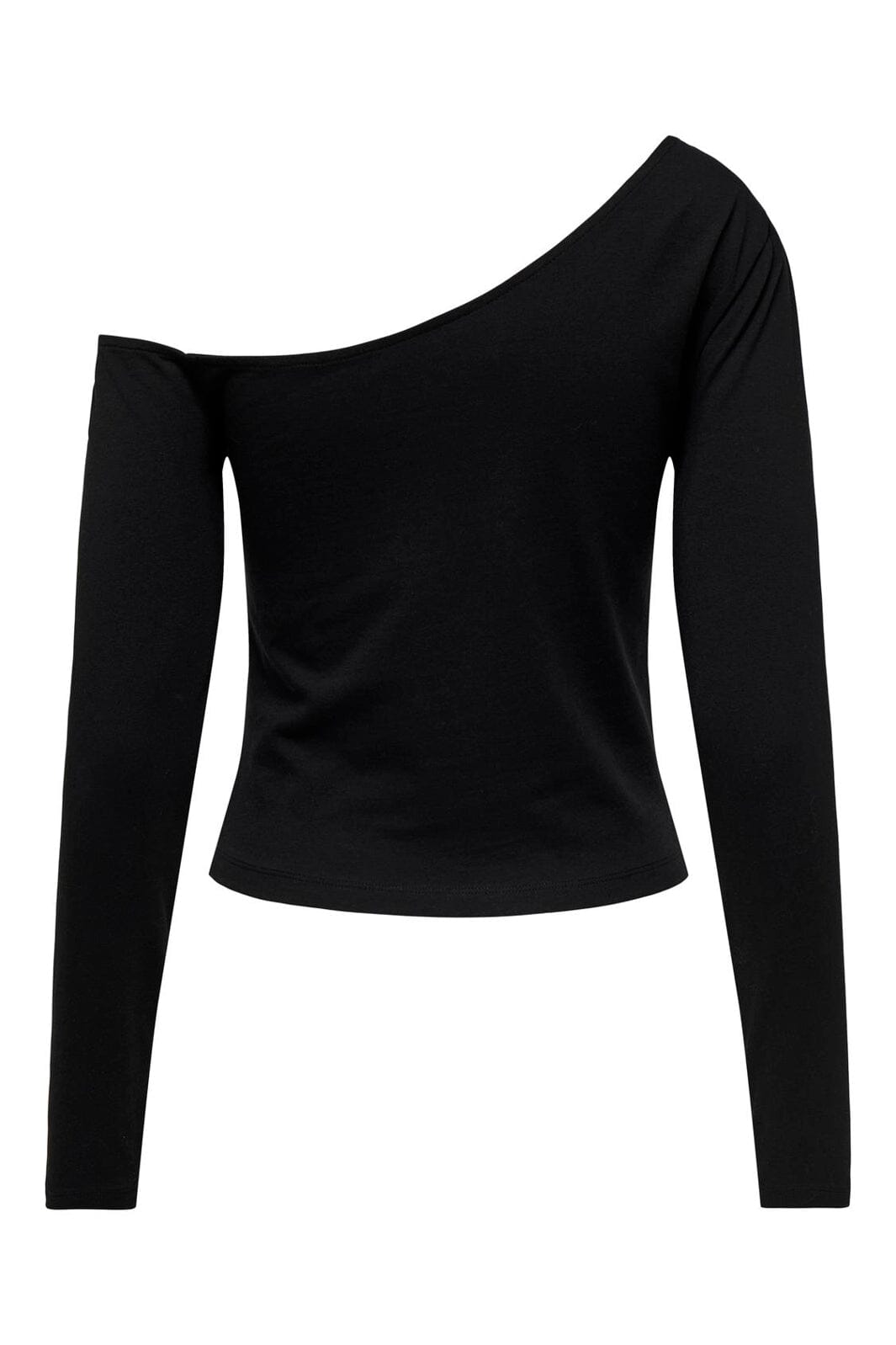 Schwarzes One-Shoulder-Top von Only mit langen Ärmeln. Das Top hat ein asymmetrisches Design mit freier Schulter und einer regulären Passform, die gute Bewegungsfreiheit bietet.