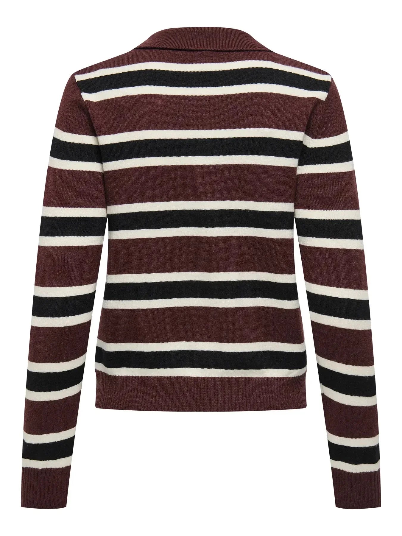 Gestreifter Polo-Strick von Only in braunen und bordeauxfarbenen Tönen mit schwarzen und weißen Streifen. Der Strick hat einen Polo-Kragen und lange Ärmel.