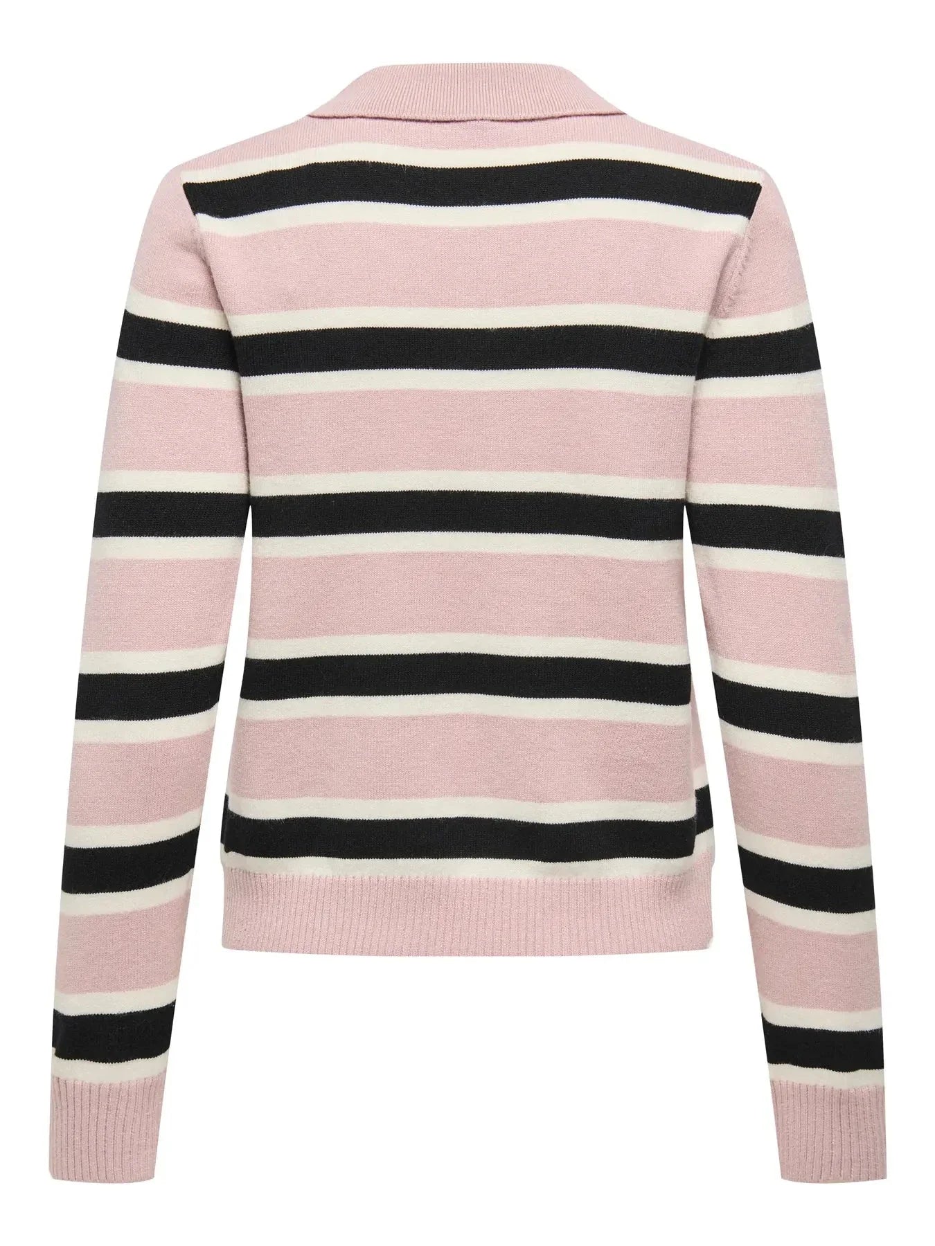Gestreifter Polostrick von Only in Rosa-Lila mit schwarzen und weißen Streifen. Der Strickpullover hat einen Polokragen und lange Ärmel.