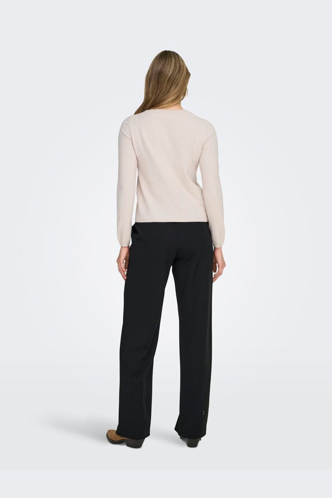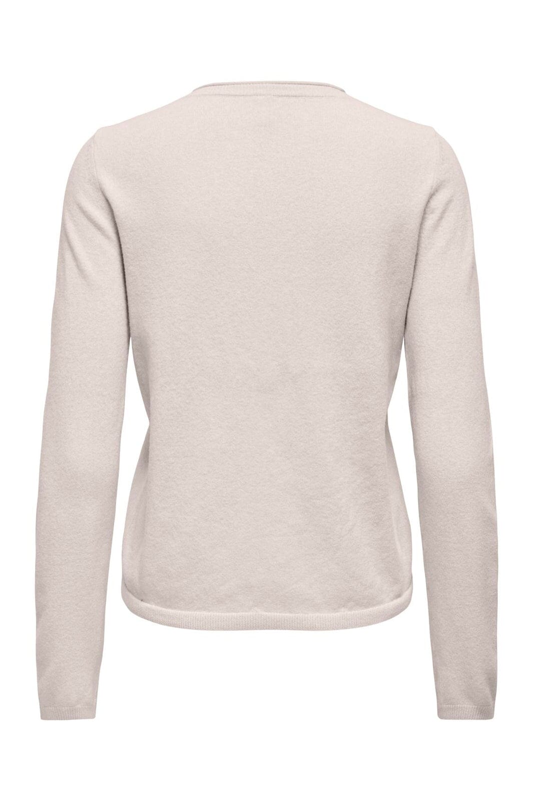 Eine helle Strickjacke von Only in einem beige melierten Ton. Die Strickjacke hat lange Ärmel, einen runden Halsausschnitt und eine Knopfleiste vorne.