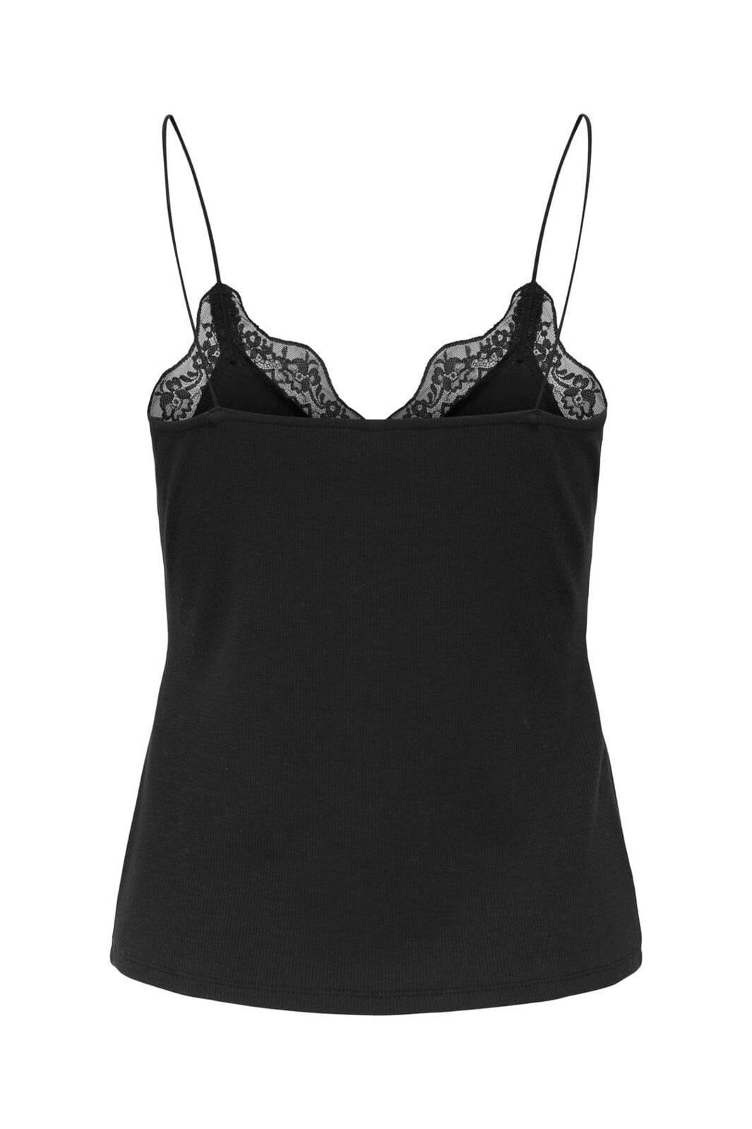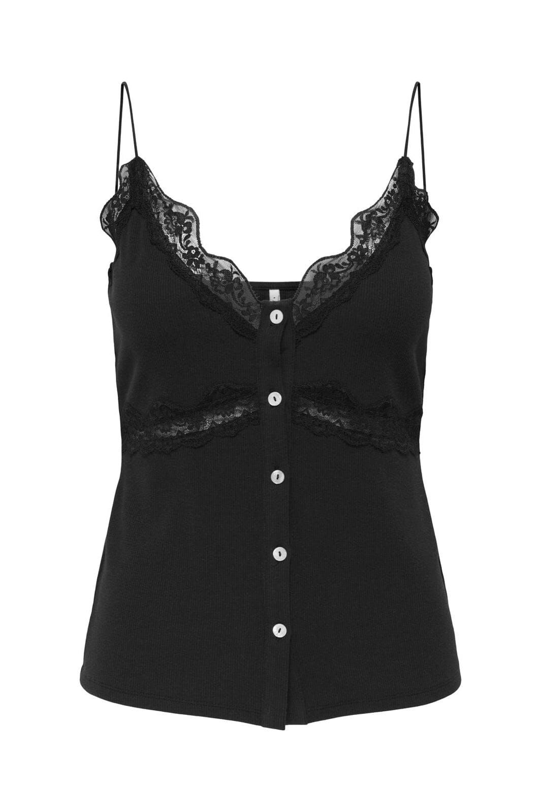 Schwarzes Tanktop von Only mit Spitzenkante und Knopfverschluss. Das Top hat einen V-Ausschnitt und dünne Träger, die für eine schmale Passform sorgen.