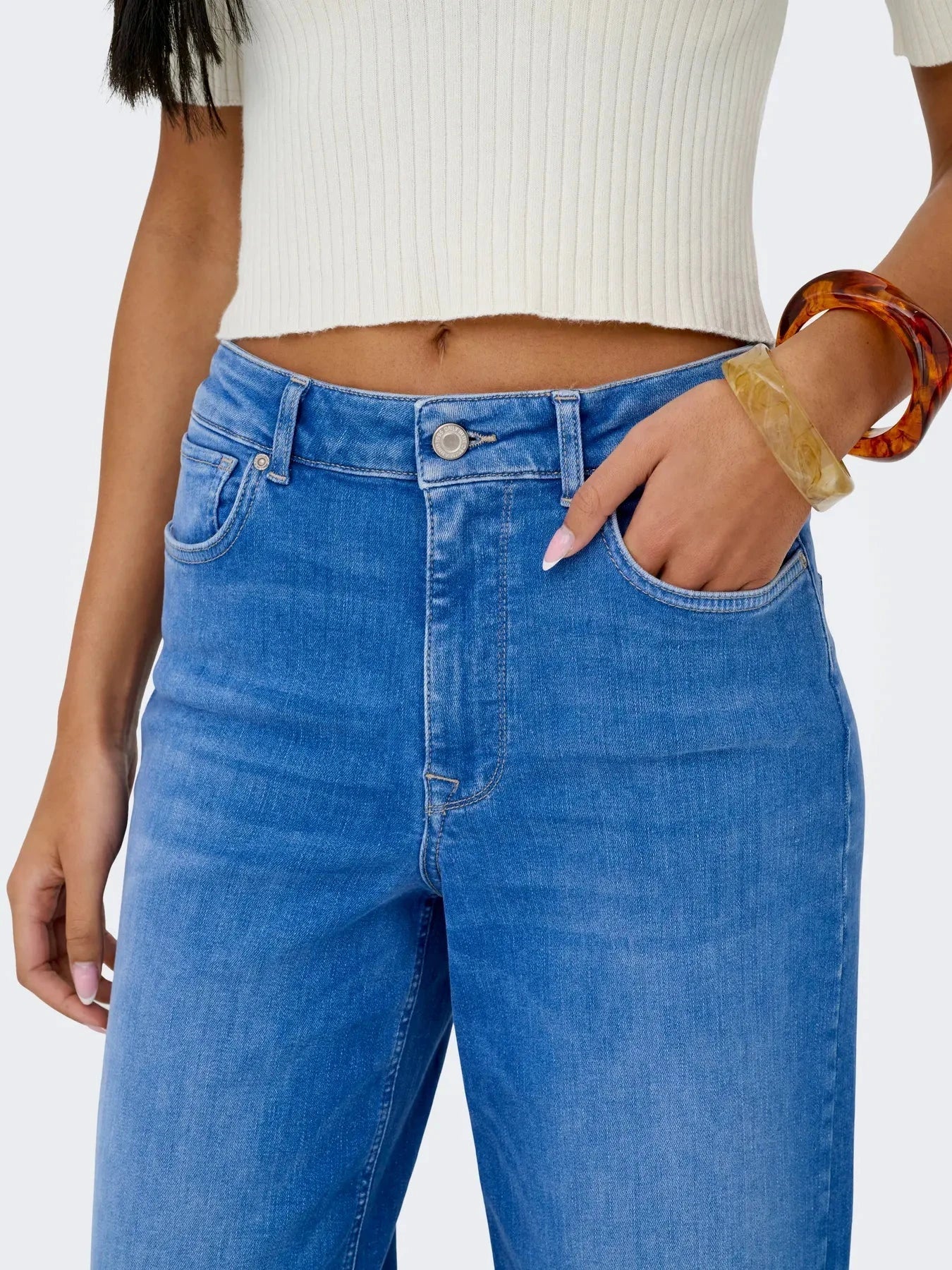Weite Jeans von Only in einem klaren blauen Denimton. Die Jeans hat eine hohe Taille und eine lockere Passform mit weiten Beinen.
