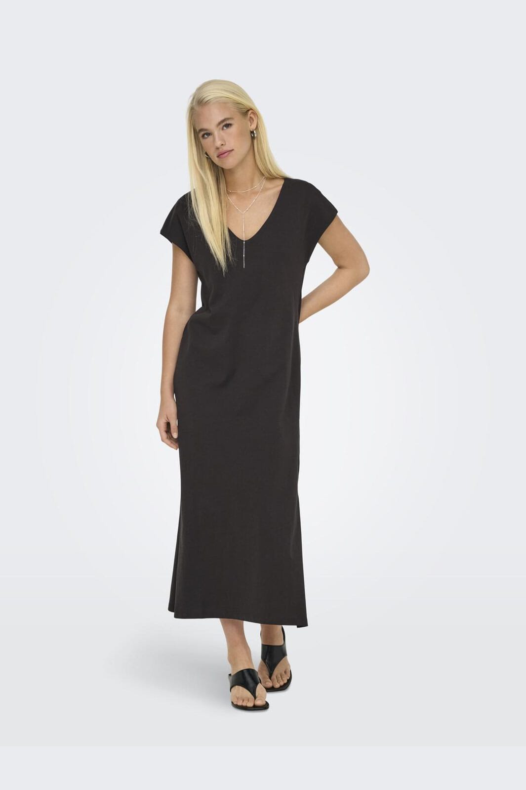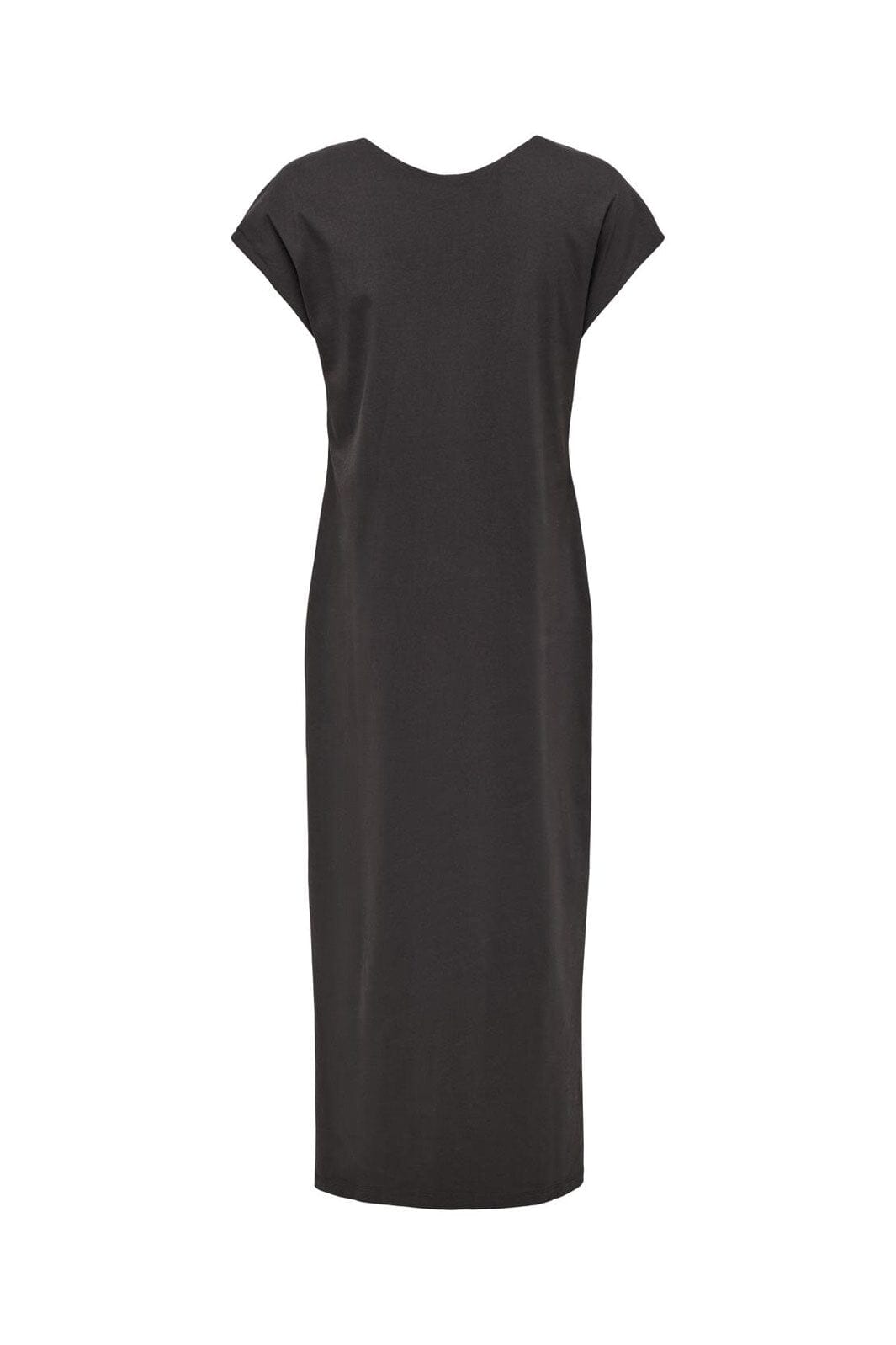 Ein Kleid von Only in einem dunklen Braunton. Es hat einen V-Ausschnitt und kurze Ärmel mit einer geraden Passform, die bis zu den Knöcheln reicht. Die Seitenschlitze bieten gute Bewegungsfreiheit.