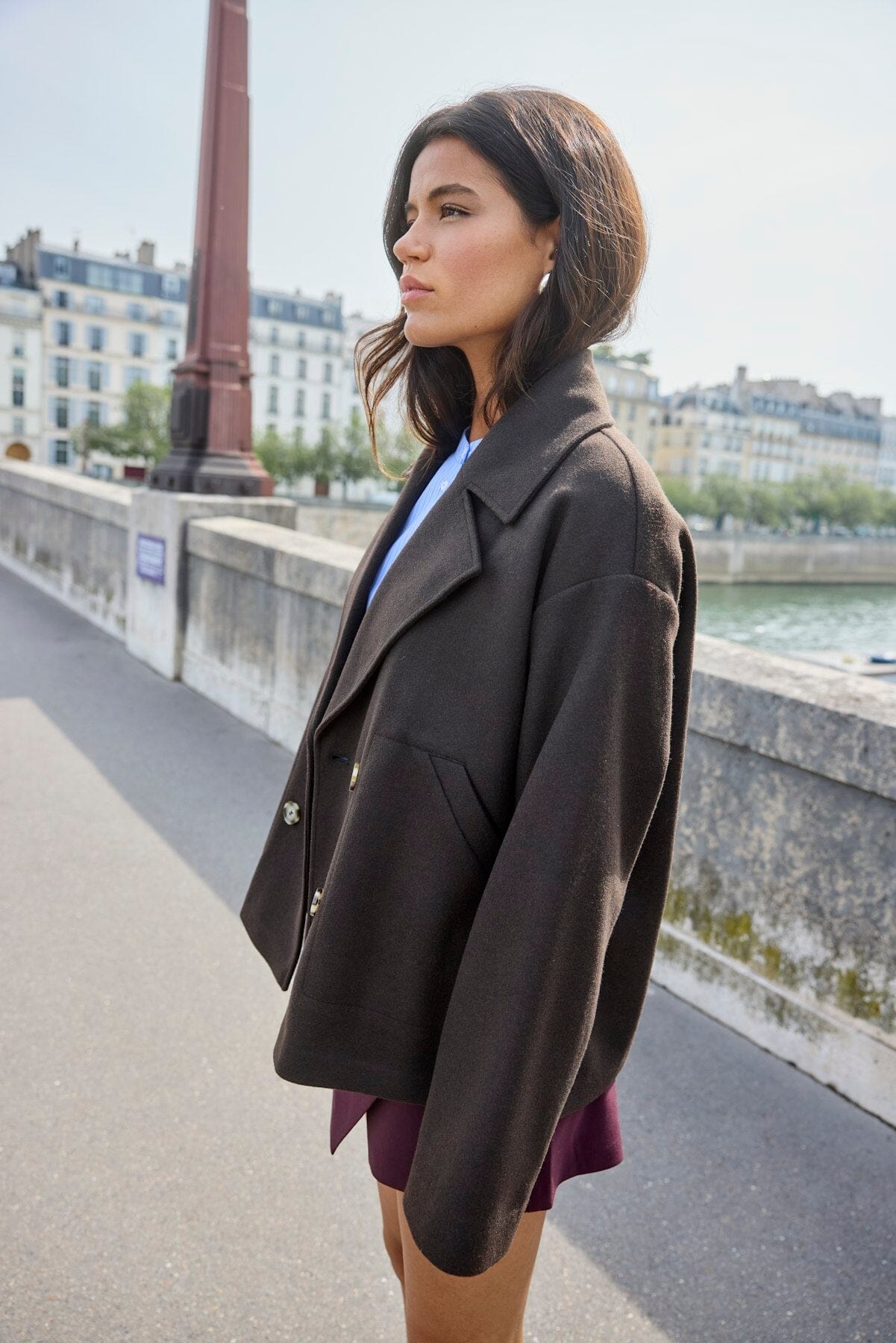 Dunkelbraune Jacke von Only mit doppelreihigem Verschluss. Sie hat einen breiten Kragen und lange Ärmel, die für gute Abdeckung sorgen. Die Seitentaschen machen die Jacke praktisch für den Alltag.