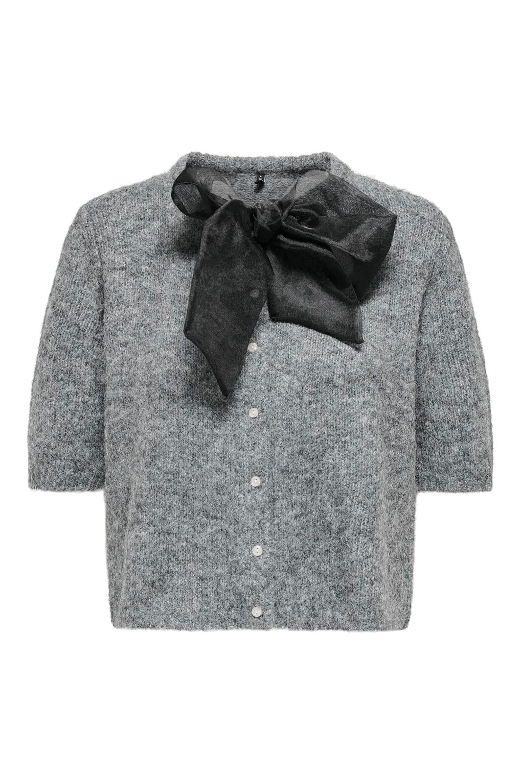 Dunkelgraue Strickjacke von Only mit kurzärmligem Design. Die Strickjacke hat eine große schwarze Schleife am Hals und Knöpfe entlang der Mitte.