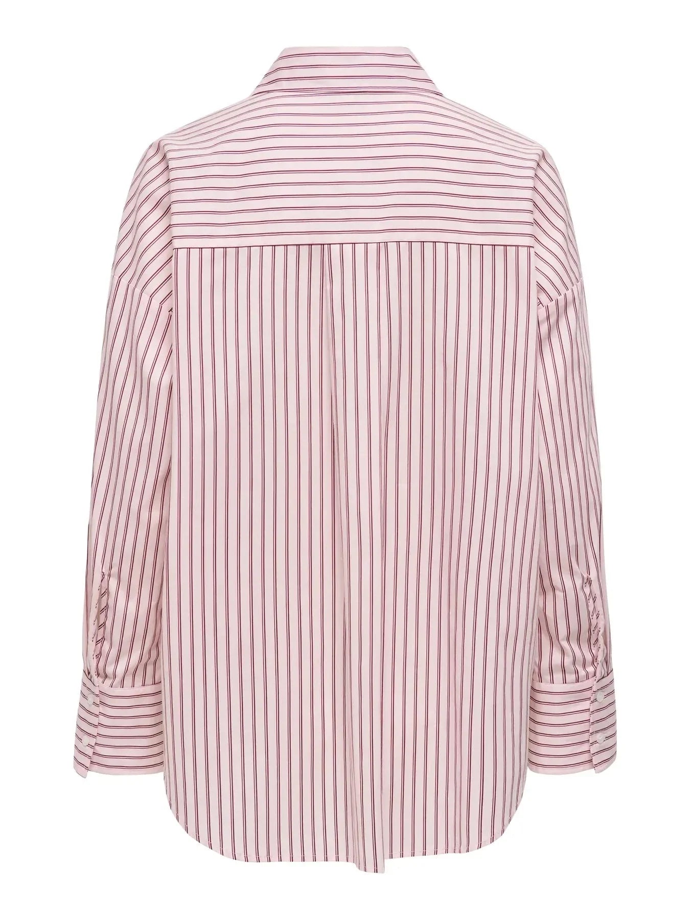 Ein gestreiftes Hemd von Only mit rosa und bordeauxfarbenen Streifen auf weißem Hintergrund. Das Hemd hat eine Knopfleiste, lange Ärmel und einen klassischen Hemdkragen.