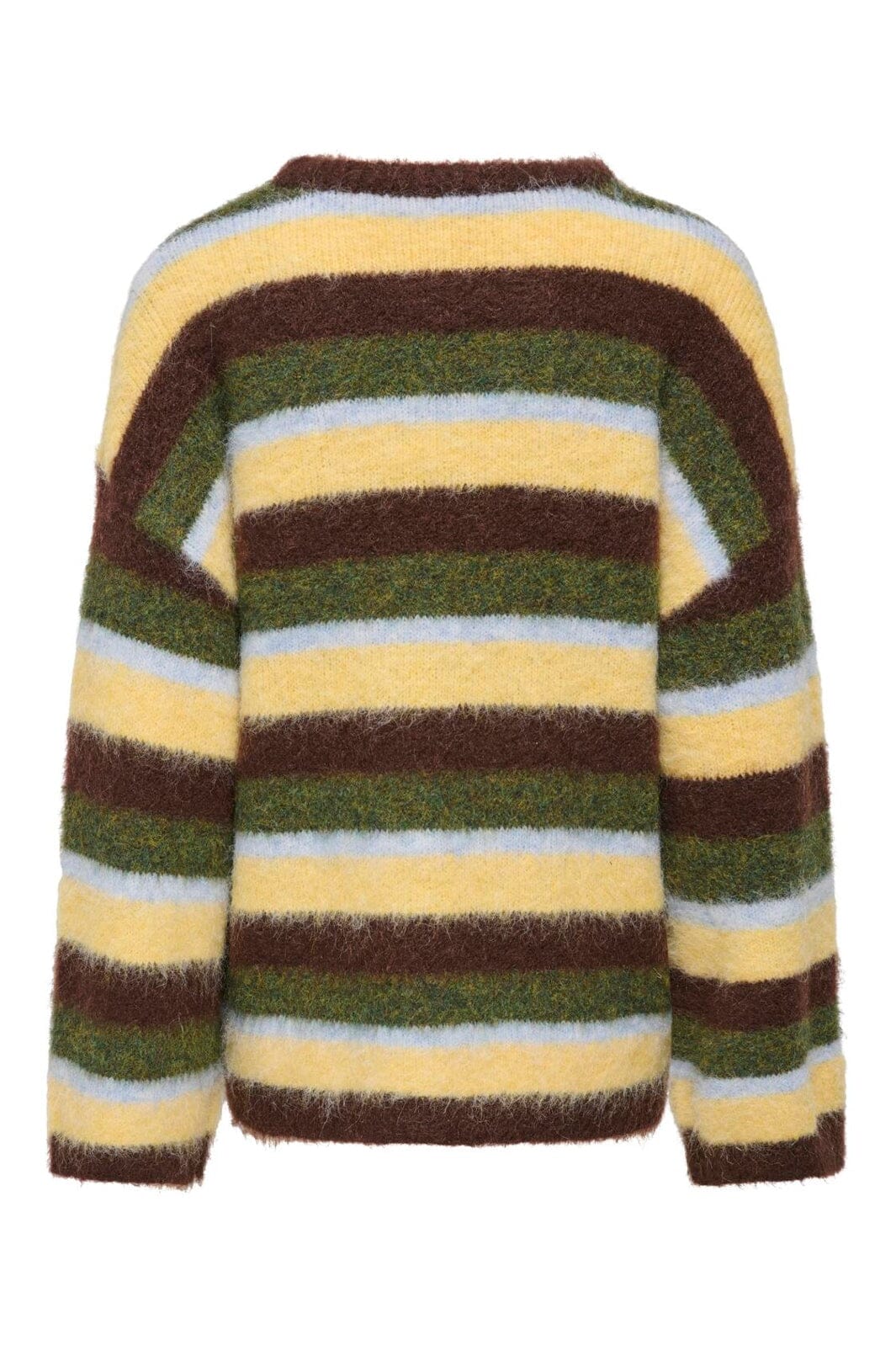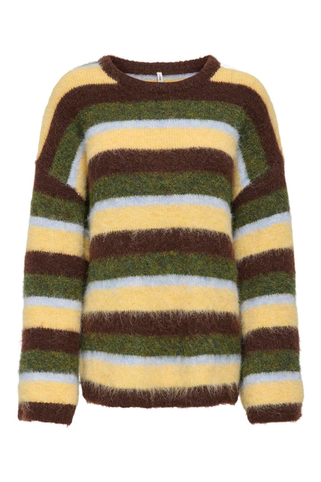 Gestreifter Strickpullover von Only mit horizontalen Streifen in Braun, Grün, Gelb und Hellblau. Der Strickpullover hat einen Rundhalsausschnitt und lange Ärmel mit abgesenkten Schulternähten.