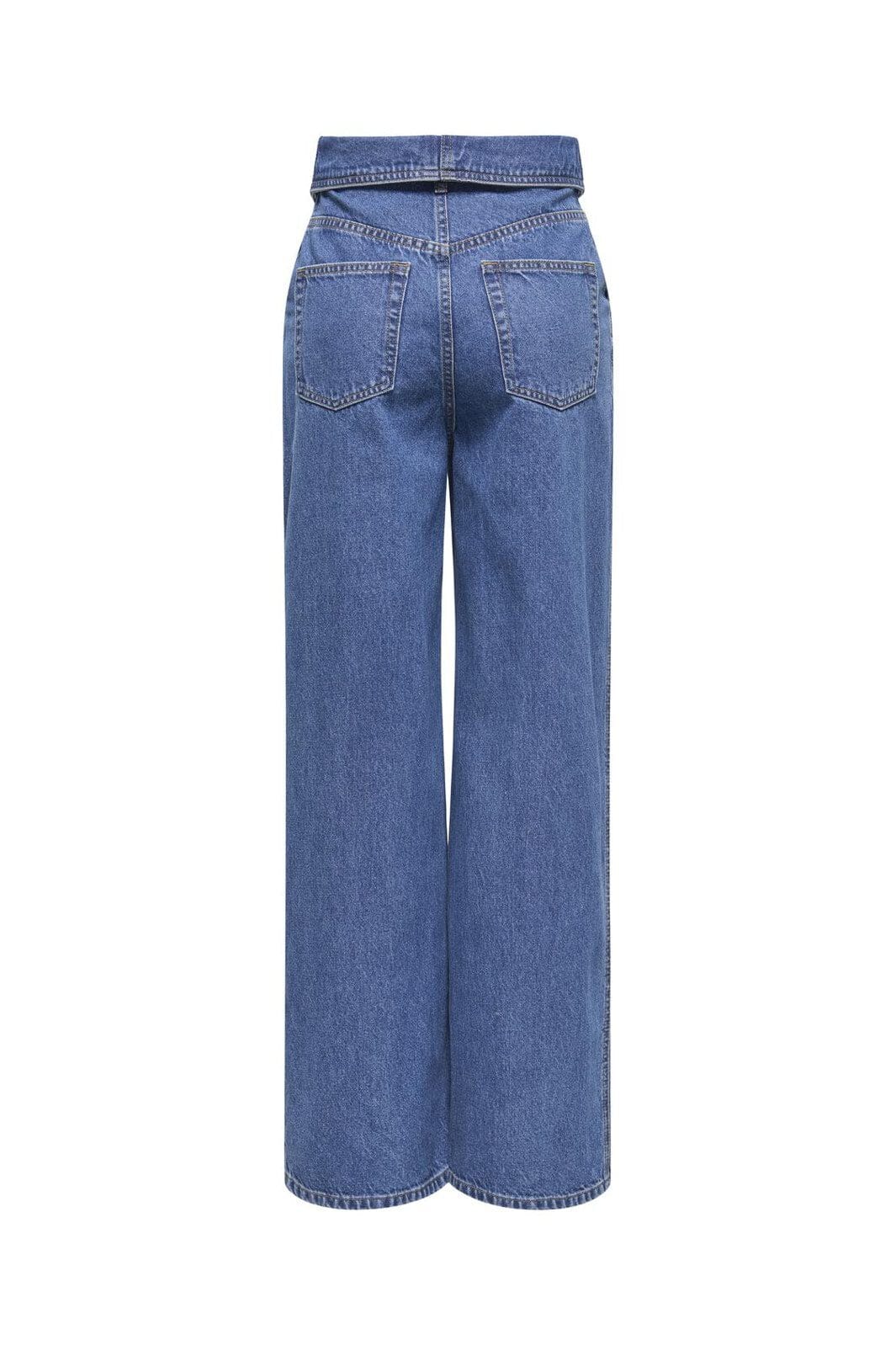 Weite Jeans von Only in mittelblauem Denim mit einem breiten Gürtel an der Taille. Die Hose hat eine lockere Passform und weite Beine von der Hüfte bis zum Knöchel.