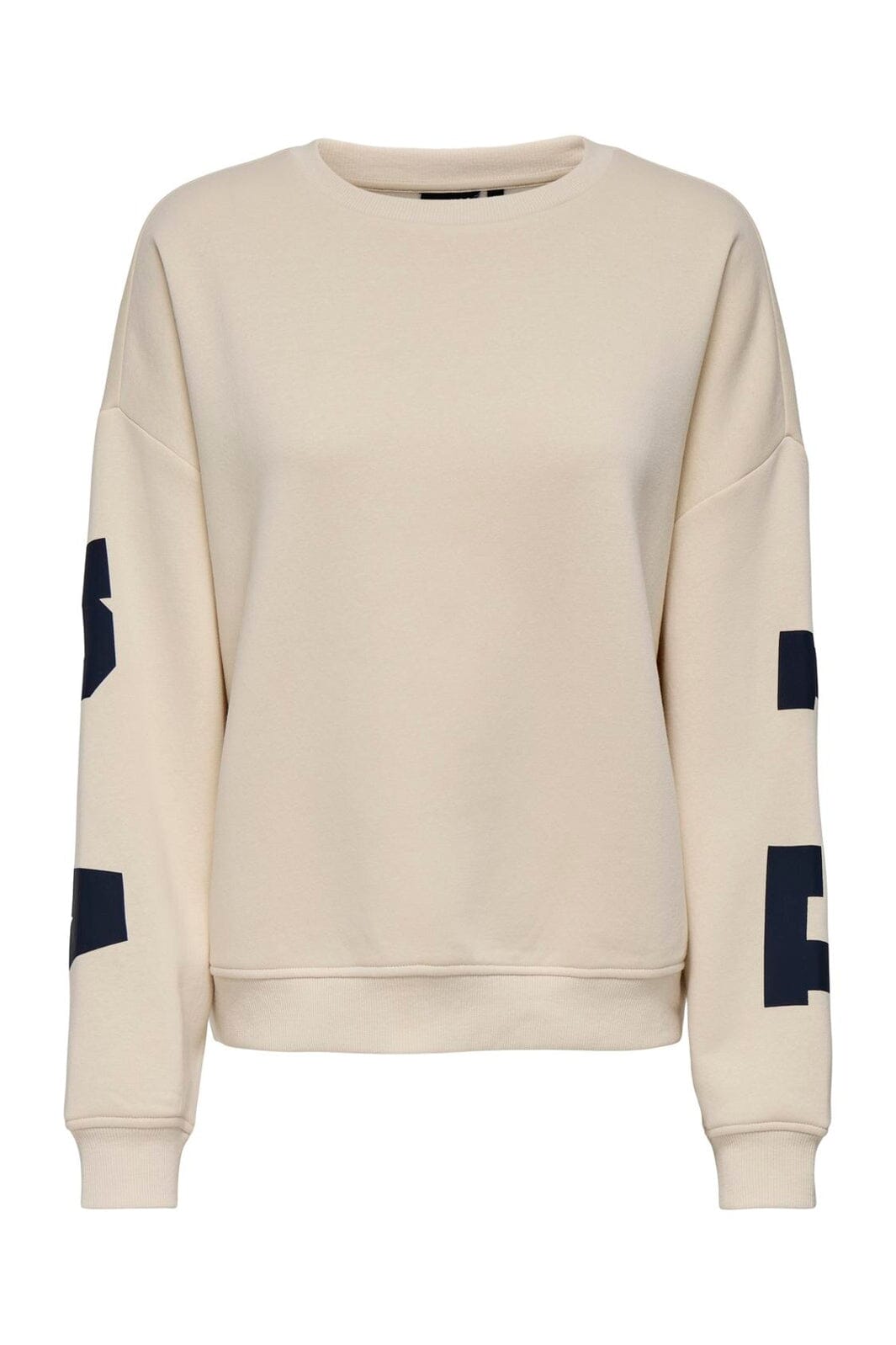 Sweatshirt von Only in einem hellbeigen Farbton mit dunkelblauem Print an Ärmeln und Rücken. Das Sweatshirt hat einen Rundhalsausschnitt und lange Ärmel.