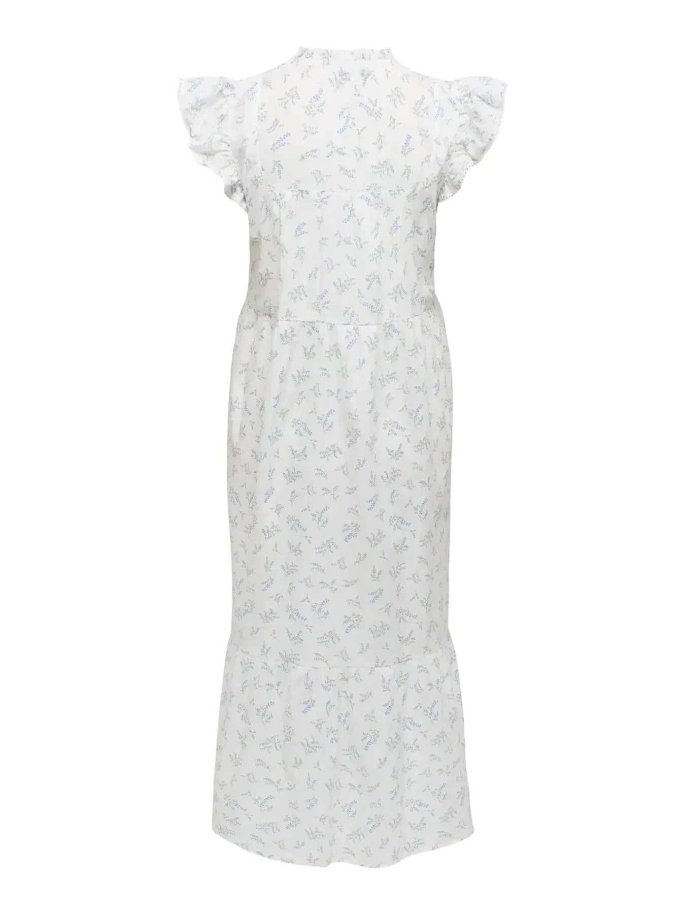 Langes Kleid von Only in einem Off-White-Ton mit einem klein geblümten Muster. Das Kleid hat Volantärmel, einen V-Ausschnitt und eine Regular-Fit-Passform.