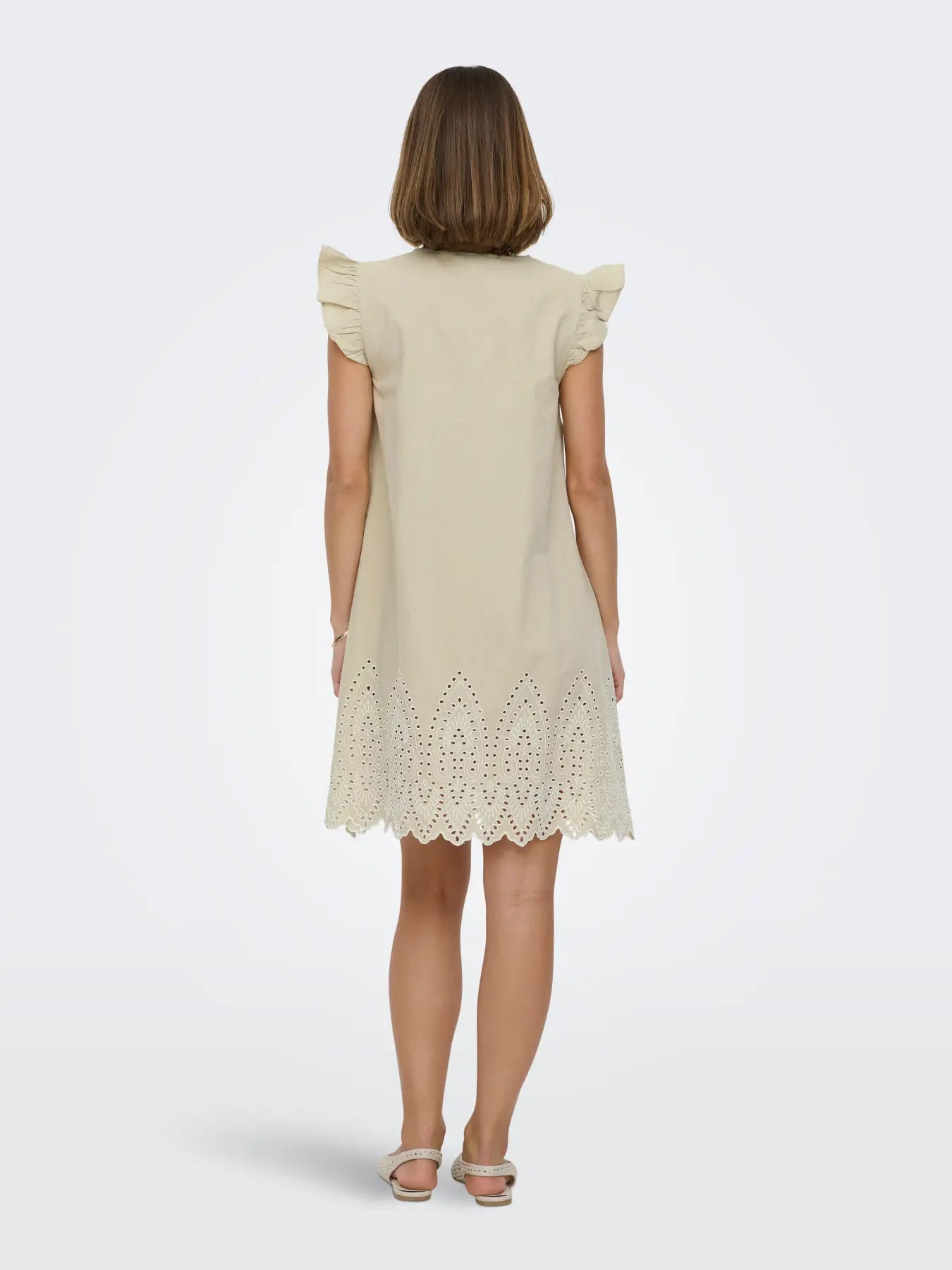 Ein grünes/graues Kleid von Only aus 100% Baumwolle mit weißen Stickereien entlang des Saums. Das Kleid hat kurze Volantärmel und einen V-Ausschnitt.