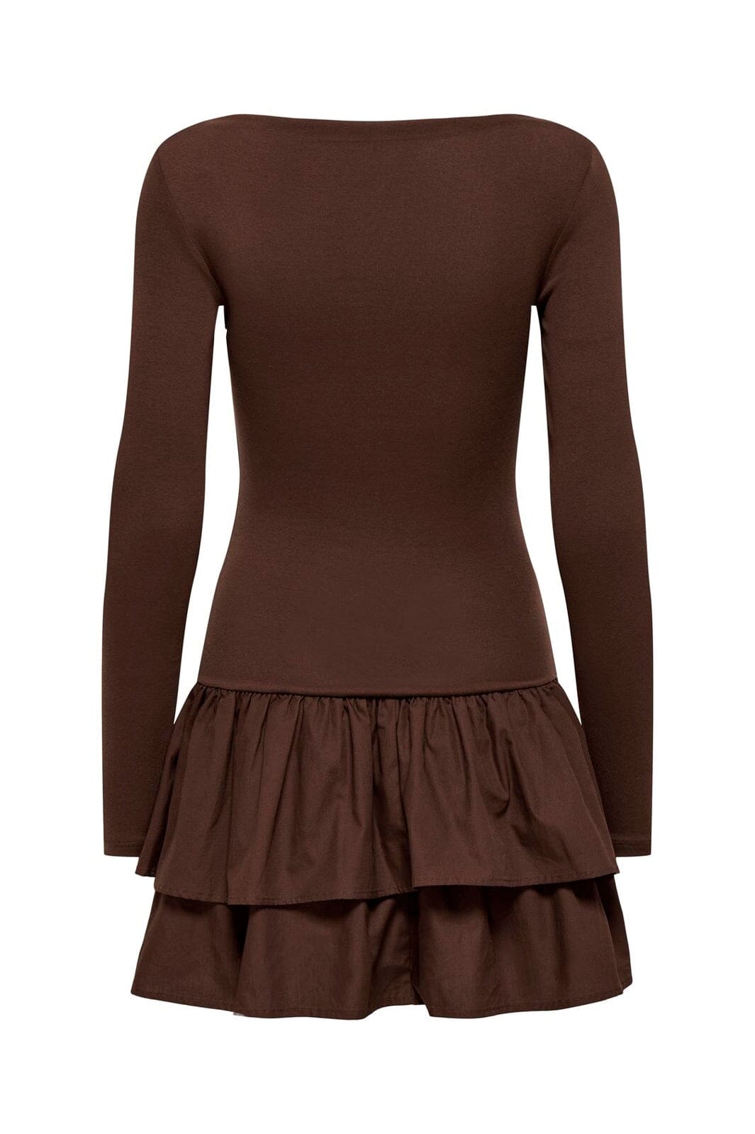 Braunes Kleid von Only mit U-Boot-Ausschnitt und langen Ärmeln. Das Kleid hat eine normale Passform und einen knielangen Rock mit Rüschen und Falten am Saum.