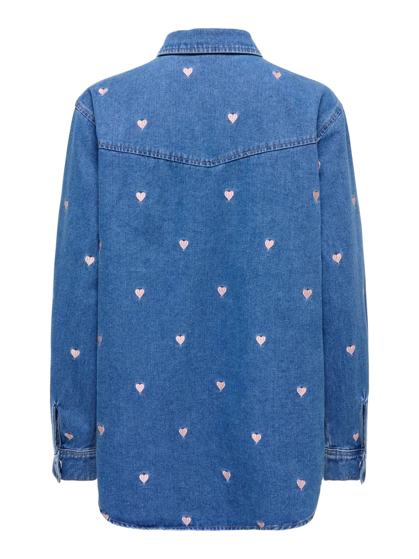 Ein Denimhemd von Only in mittelblauer Farbe mit kleinen gestickten Herzen über den gesamten Stoff verteilt. Das Hemd hat lange Ärmel und einen klassischen Hemdkragen.