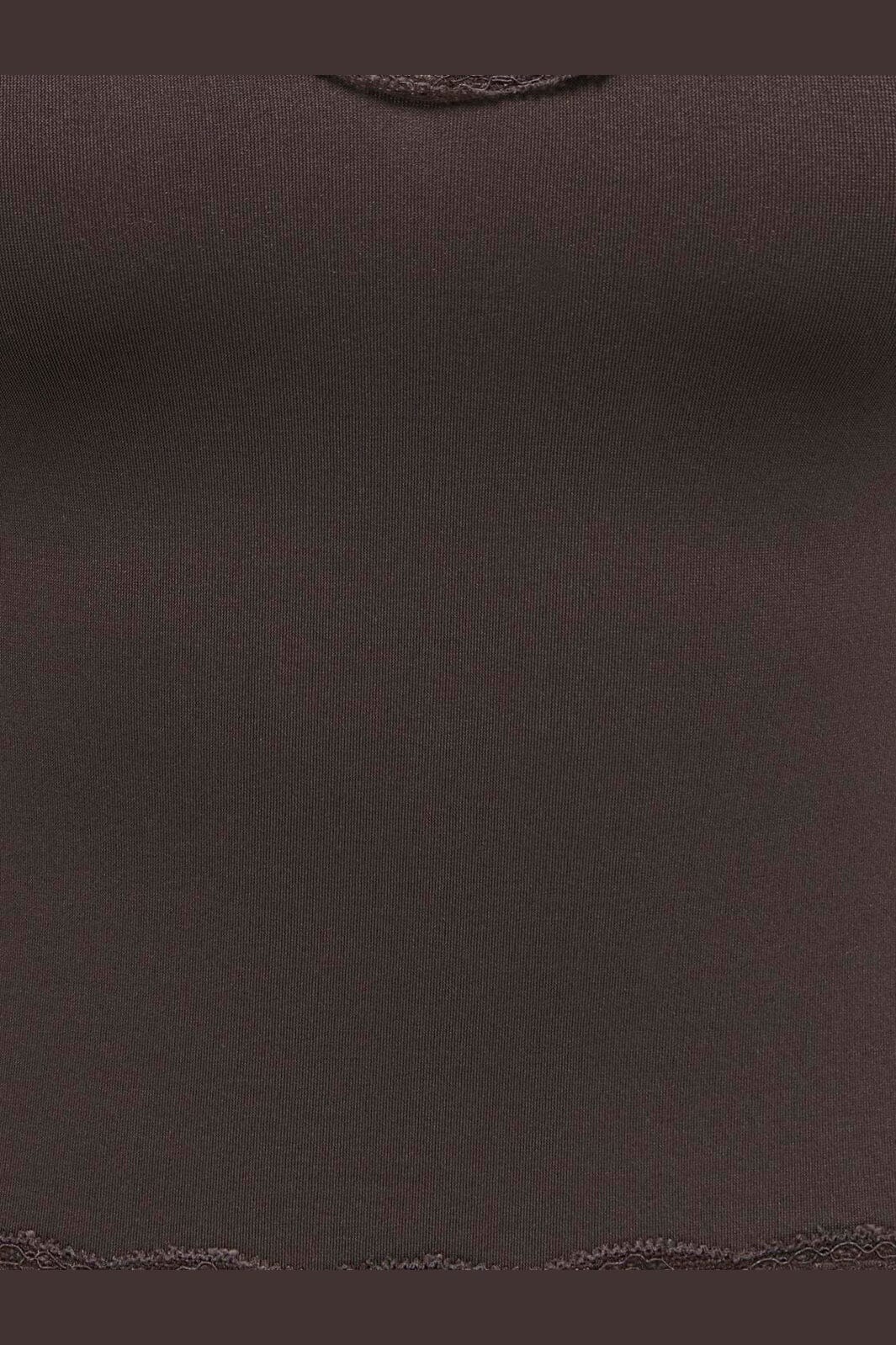 Braunes, kurzes Top von Only mit Spitzenkanten. Das Top hat einen V-Ausschnitt und ist aus einem weichen, dehnbaren Material mit feinen Spitzendetails entlang der Kanten gefertigt.