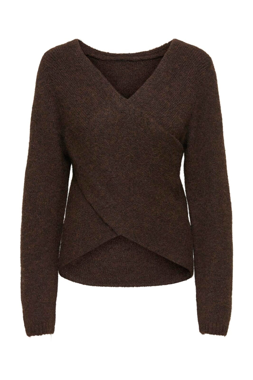 Wendbarer Strickpullover von Only in dunkelbrauner Farbe. Der Pullover hat ein V-Ausschnitt-Design auf der einen Seite und einen Rundhalsausschnitt auf der anderen.