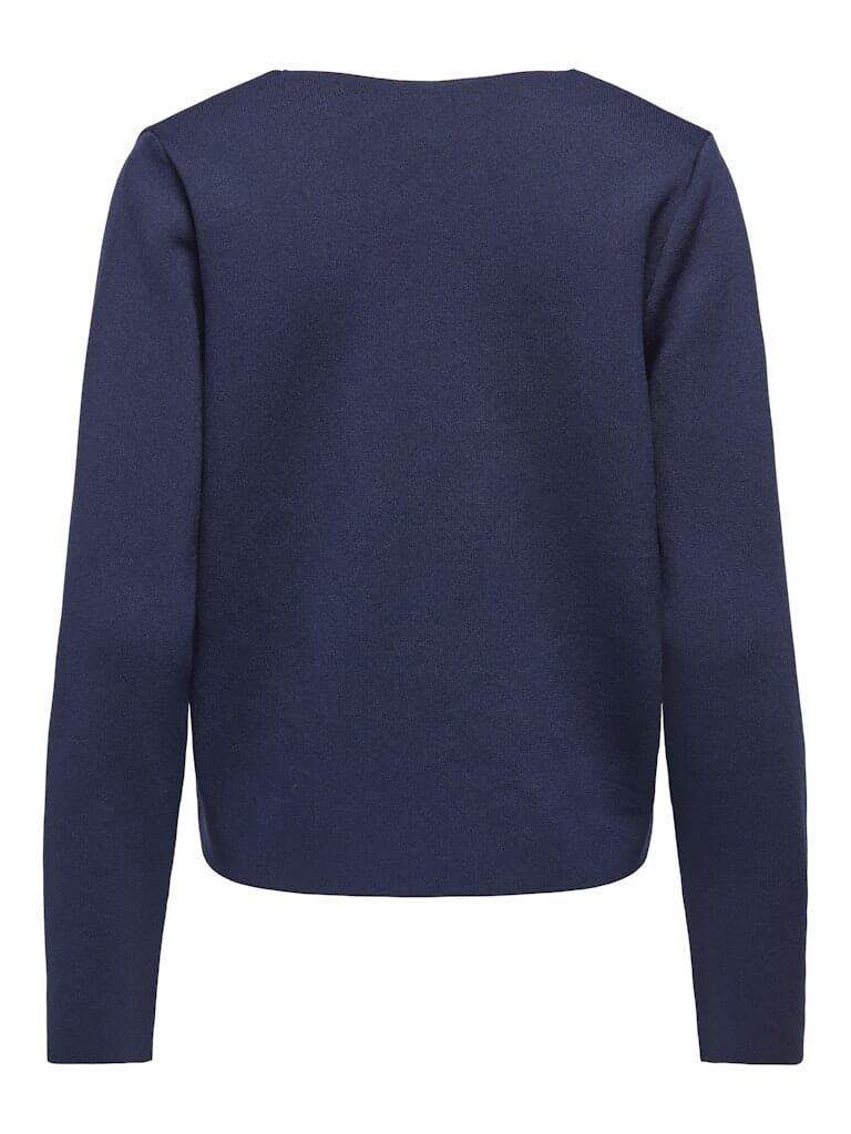 Dunkelblaue Strickjacke von Only mit vier sichtbaren goldfarbenen Knöpfen auf der Vorderseite. Die Strickjacke hat einen V-Ausschnitt und lange Ärmel.