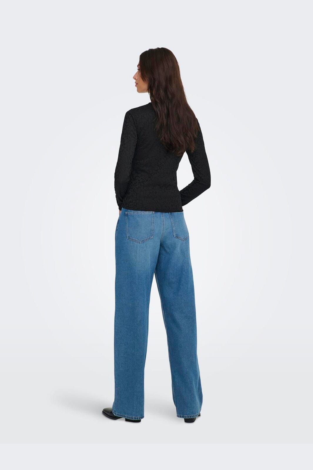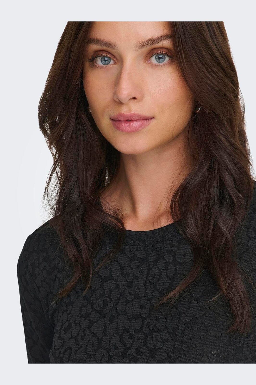 Schwarzes langärmeliges Oberteil von Only mit Rundhalsausschnitt und Leopardenmuster. Das Oberteil hat eine körpernahe Passform und ist aus einer weichen, dehnbaren Qualität gefertigt, was es angenehm zu tragen macht.