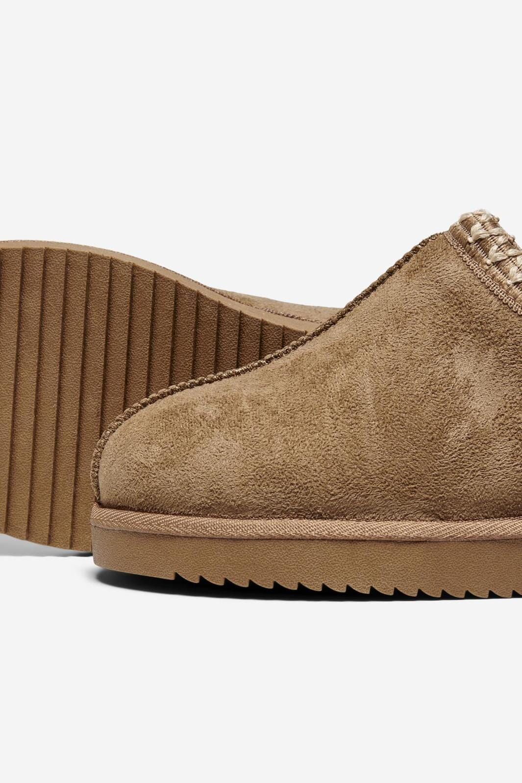 Hausschuhe von Only aus cognacfarbenem synthetischem Wildleder. Der weiche Schuh hat ein warmes Teddyfutter und dekorative Nähte entlang des Randes.