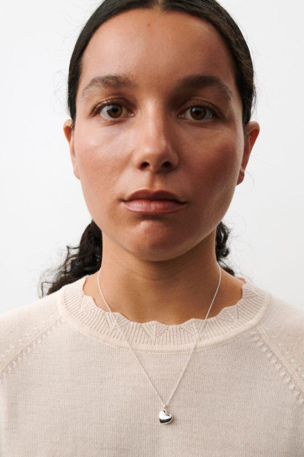 Halskette von Pernille Corydon aus Silber. Die Halskette hat einen herzförmigen Anhänger und eine feine Kette mit silberfarbener Oberfläche.