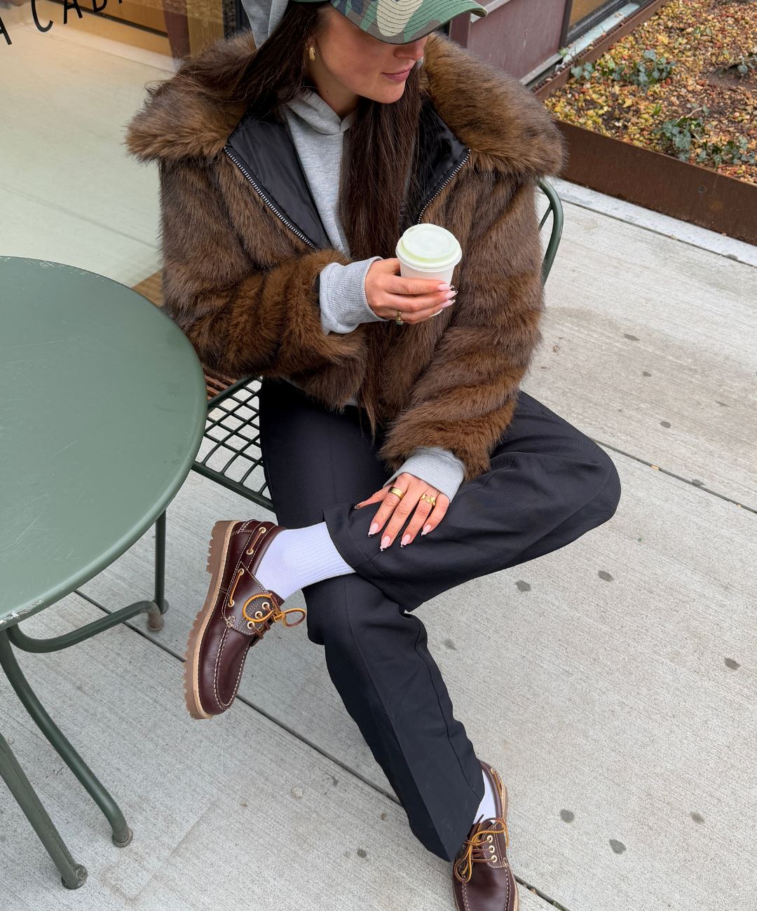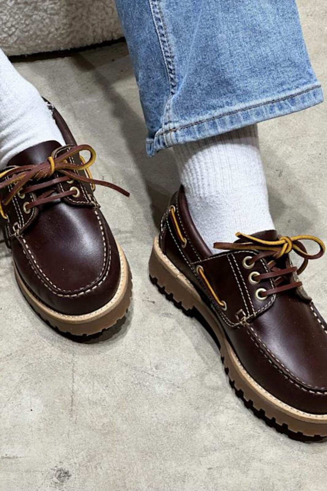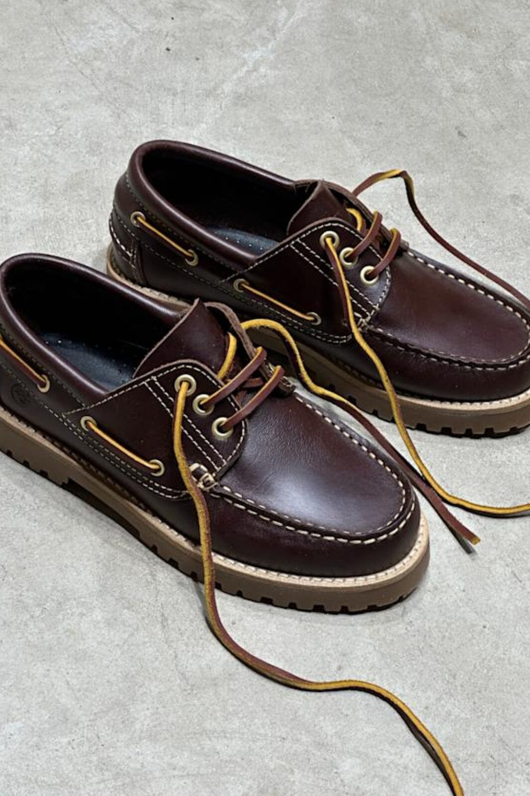 Braune Bootsschuhe von Phenumb Copenhagen aus Leder mit klassischem Schnürverschluss. Der Schuh hat eine runde Zehenpartie und einen niedrigen Absatz mit robuster Sohle, die guten Halt bietet.