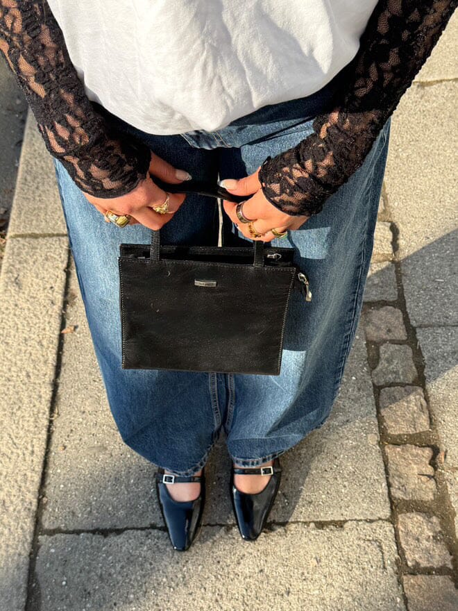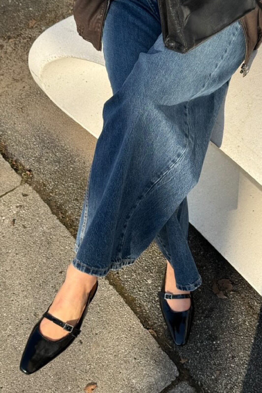 Schwarze Ballerinas von Phenumb Copenhagen aus lackiertem Leder. Die spitze Zehe und der Riemen mit Schnalle verleihen dem Schuh ein klares Design, das sowohl für den Alltag als auch für Feste geeignet ist.