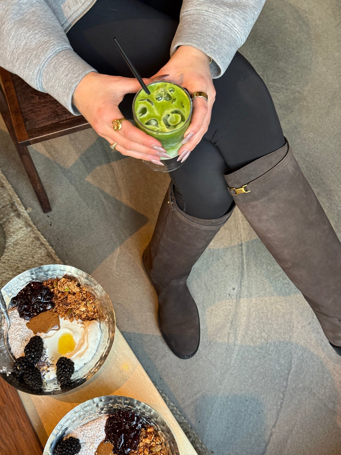 Kniehohe Stiefel von Phenumb Copenhagen aus Wildleder in einem dunkelbraunen Farbton. Die Stiefel haben eine flache schwarze Sohle und eine kleine goldfarbene Schnalle oben.