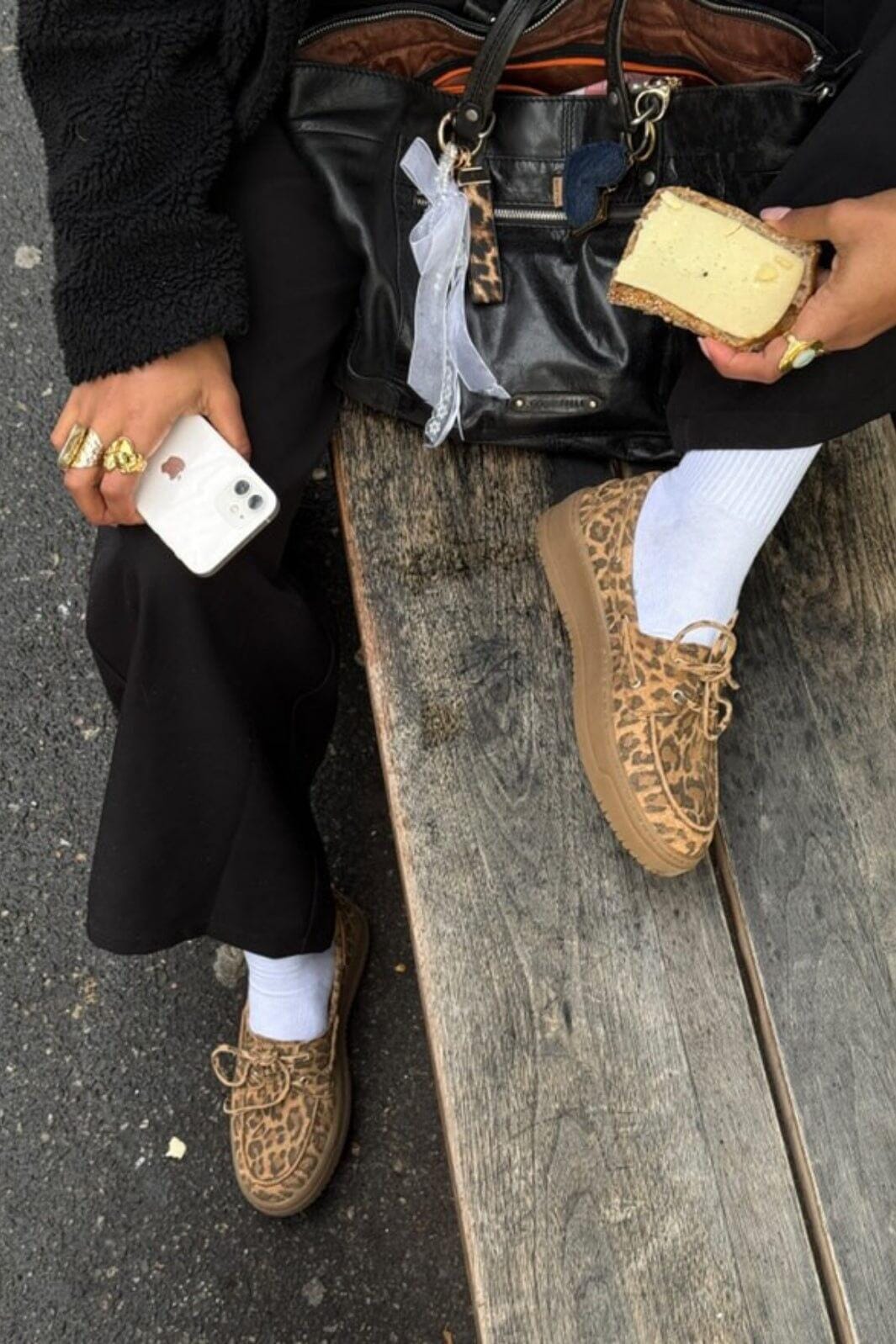 Schuhe aus Wildleder mit einem braunen Leopardenmuster. Die Schuhe haben eine runde Zehenpartie und eine Schnürung, die eine gute Passform bietet.